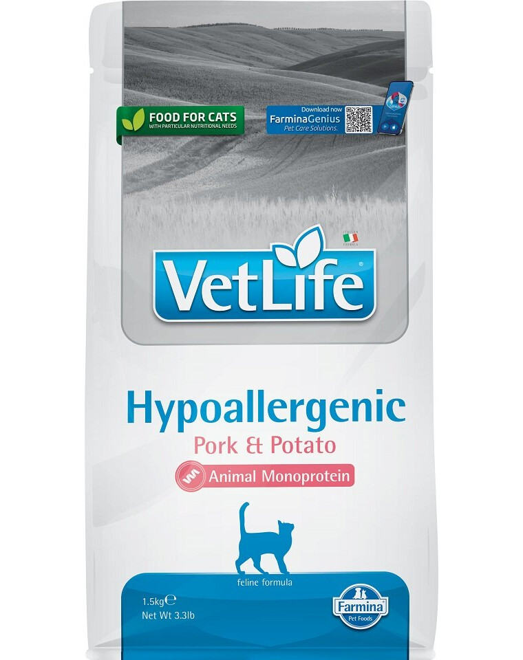 FARMINA VetLife Hypoallergenic Adult Pork Potato 1,5 kg - porc & pomme de terre nourriture diététique pour chats destiné à réduire les intolérances aux ingrédients