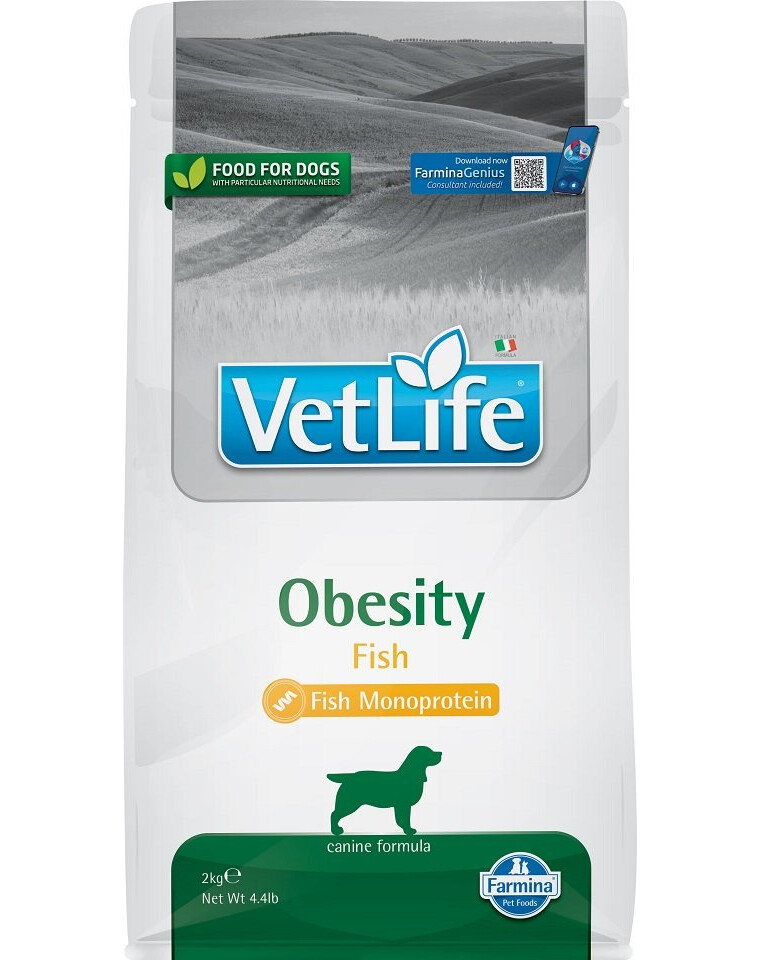 Farmina Vet Life Obesity Fish est une nourriture complète pour chiens destinée à la réduction du poids corporel excessif et à la régulation de l'apport en glucose (diabète sucré).