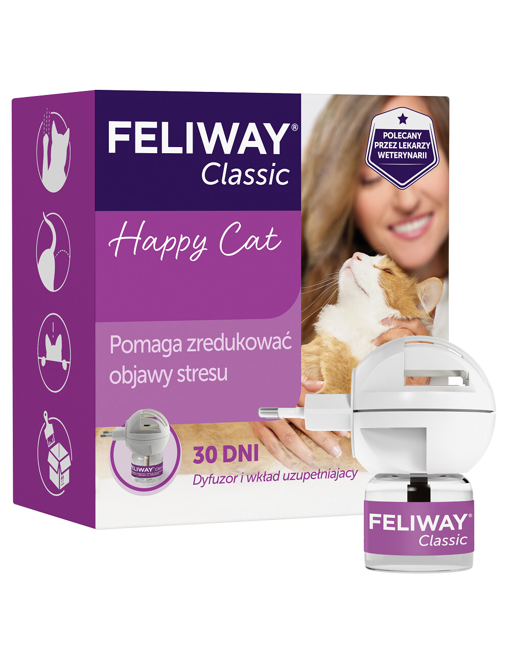 Feliway est une forme synthétique des phéromones de joues félines, que les chats utilisent dans leur environnement naturel pour marquer leur territoire comme sûr et amical. Ces phéromones aident les chats à se sentir en sécurité et à l'aise lorsqu'ils changent d'environnement à l'occasion d'un déménagement, de l'achat d'un chaton ou d'une adoption. Ils aident également à résoudre le problème des pics d'urine. Des études cliniques ont montré une réduction de l'injection d'urine allant jusqu'à 91 %. Dans ce cas, le diffuseur doit être allumé dans la pièce où le chat marque la zone. Il est nécessaire d'utiliser des diffuseurs dans chaque pièce. Le diffuseur doit être laissé en marche pendant au moins 4 semaines. En cas d'utilisation prolongée, remplacer la cartouche. En même temps que le diffuseur, Feliway Spray peut être utilisé en vaporisant les zones marquées. Nettoyez ensuite la zone traitée et laissez-la sécher. Vaporisez ensuite cette zone et les objets visibles les plus proches tous les jours. La pulvérisation de la zone peut être complétée lorsque le chat lui-même laisse des phéromones de joue sur la zone en frottant avec son museau. Il a également été prouvé que Feliway aide à réduire les griffures dues au stress. Des études cliniques ont montré une réduction des marques de griffures allant jusqu'à 96 %. Les zones griffées doivent être vaporisées avec 6 doses de Feliway Spray une fois par jour pendant au moins un mois. La pulvérisation de la zone peut être terminée lorsque le chat laisse des phéromones de joue sur la zone elle-même. Feliway est également utile aux propriétaires de plusieurs chats. Pour réduire le stress dans une maison où vivent plusieurs chats, allumez le diffuseur Feliway dans la pièce où les animaux montrent des signes de stress. Laissez le diffuseur en marche pendant au moins quatre semaines. De même, lors d'un changement dans l'environnement du chat (nouveau membre de la famille, stérilisation, déménagement, adoption, petits chatons dans un nouveau foyer), Feliway devrait être utilisé. Le diffuseur doit être allumé dans la pièce et laissé en marche pendant quatre semaines ou jusqu'à ce que le problème disparaisse. En cas d'utilisation prolongée, remplacez la cartouche. Feliway est également utile lorsque vous transportez ou laissez votre ami félin dans un hôtel pour animaux. Feliway doit être vaporisé directement à l'intérieur de la cage ou de la caisse de transport, 15 minutes avant d'y placer votre chat. Répétez l'opération avant chaque voyage ou tous les jours pendant le séjour du chat à l'hôtel. Si Feliway Spray est utilisé dans un hôtel, attendez toujours 15 minutes avant de laisser le chat retourner dans la chambre.