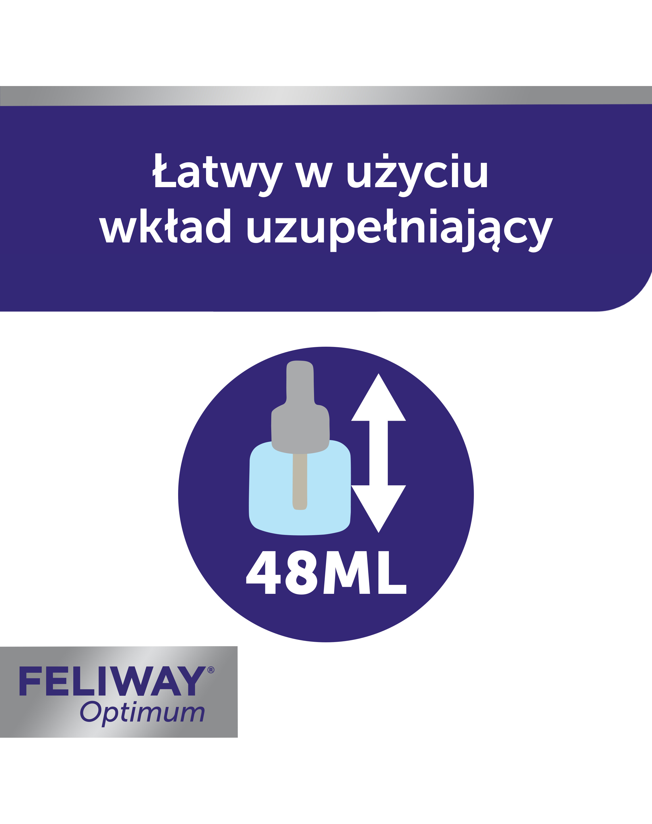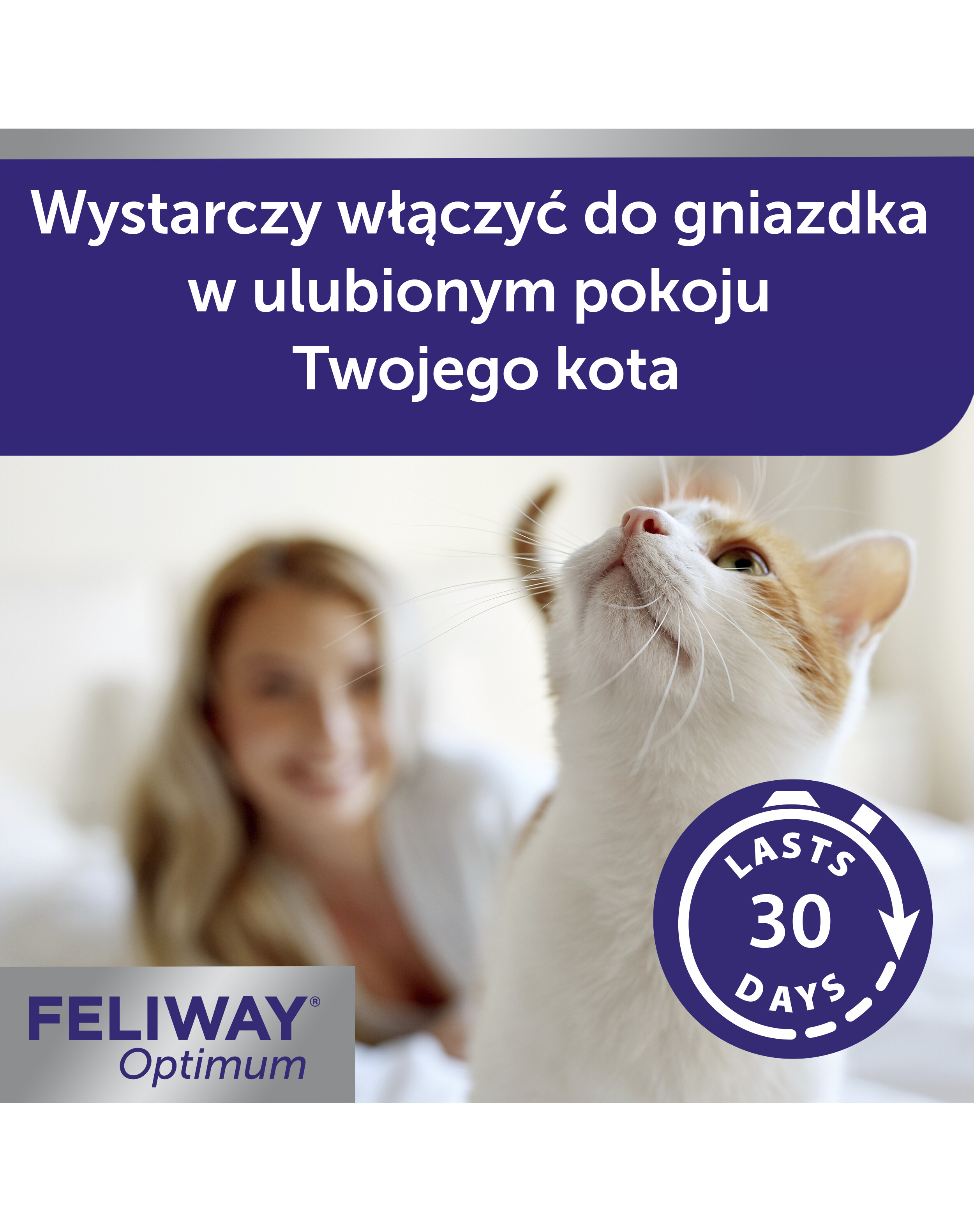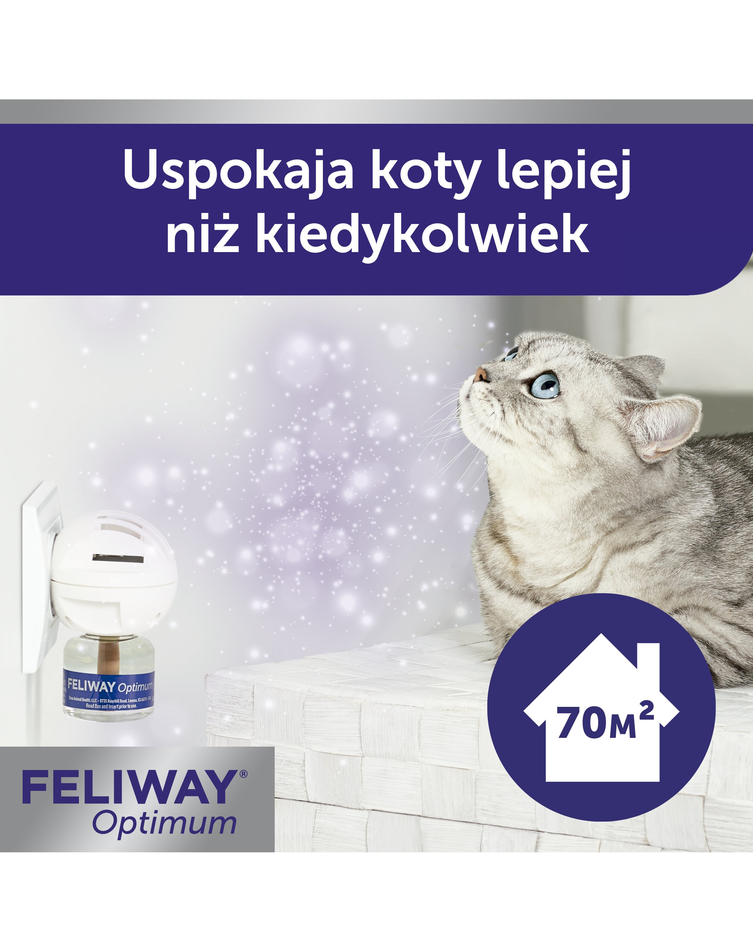 FELIWAY Optimum est un complexe avancé de phéromones félines sous forme de diffuseur et de recharge. FELIWAY Optimum aide à combattre plus de signes de stress, dans plus de situations et calme les chats mieux que jamais.