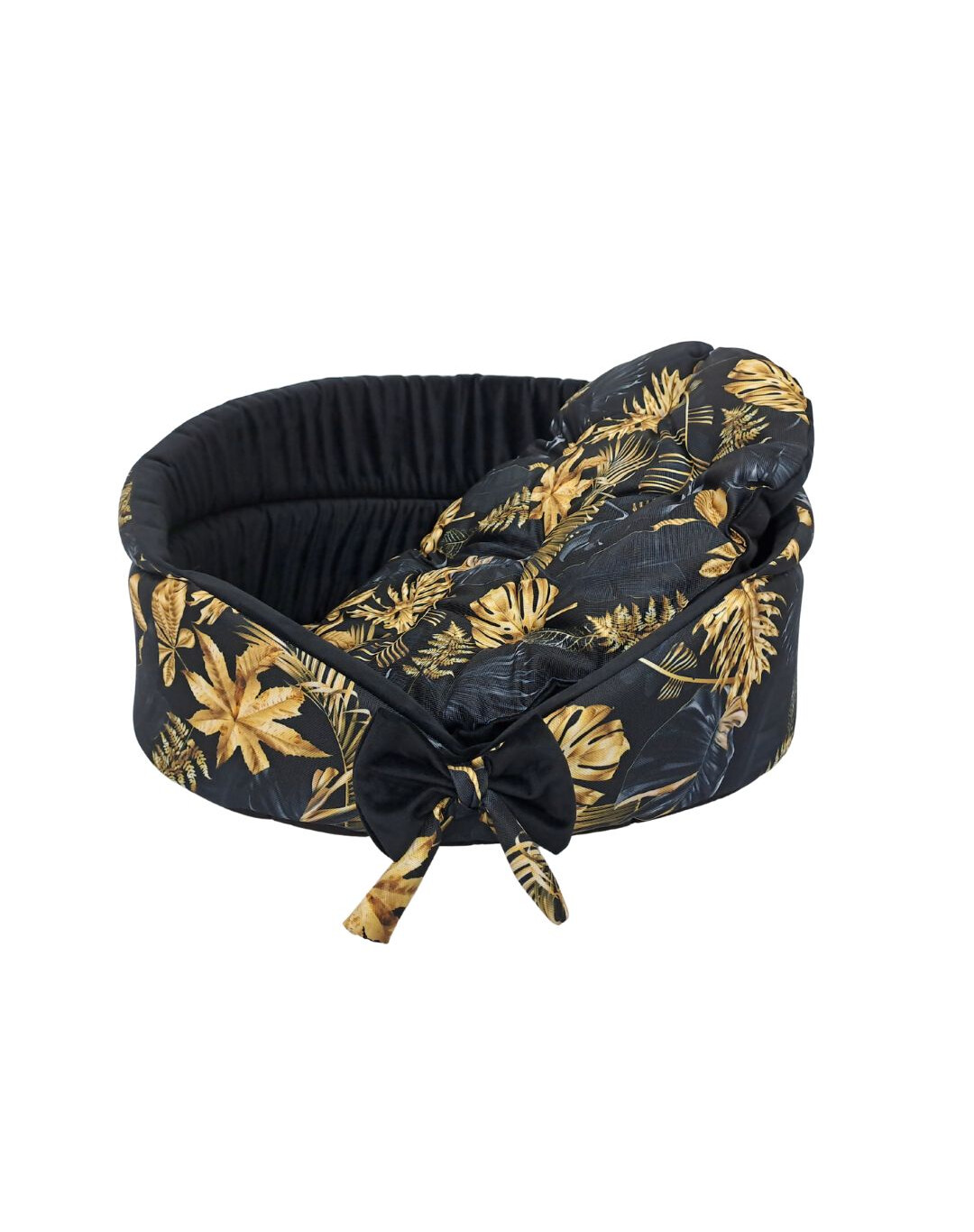 Un panier pour chien avec un coussin doux et amovible à l'intérieur. Le coussin amovible facilite le nettoyage du panier. Le coussin est matelassé et double face - une face est noire et l'autre est recouverte d'un tissu à motifs de feuilles.