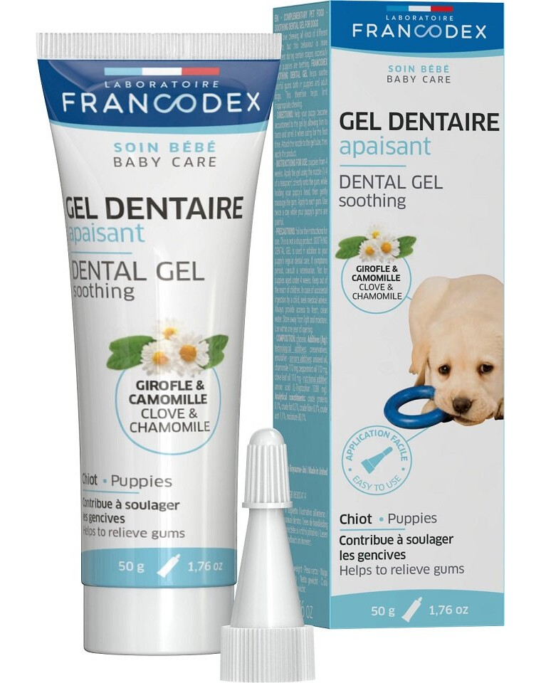 Utilisation : chiots à partir de 4 semaines. Appliquer le gel à l'aide du tube (volume ¼ cuillère à café) directement sur les gencives, en tenant la tête du chien, puis masser doucement les gencives. Appliquer sur toutes les gencives. Appliquer 2 fois par jour tant que les gencives sont douloureuses.