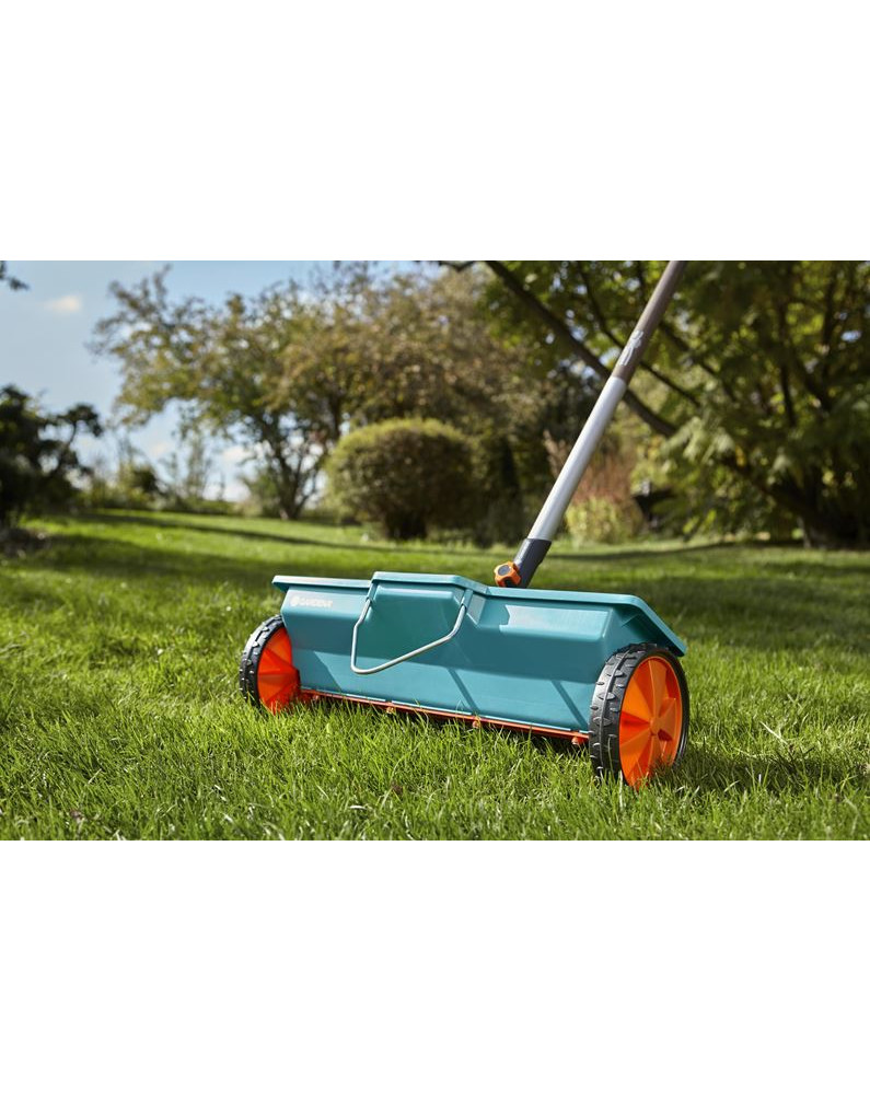 La distribution minutieuse de l'engrais pour gazon et l'épandage des semences sont assurés par le rouleau intégré avec barre de raclage.