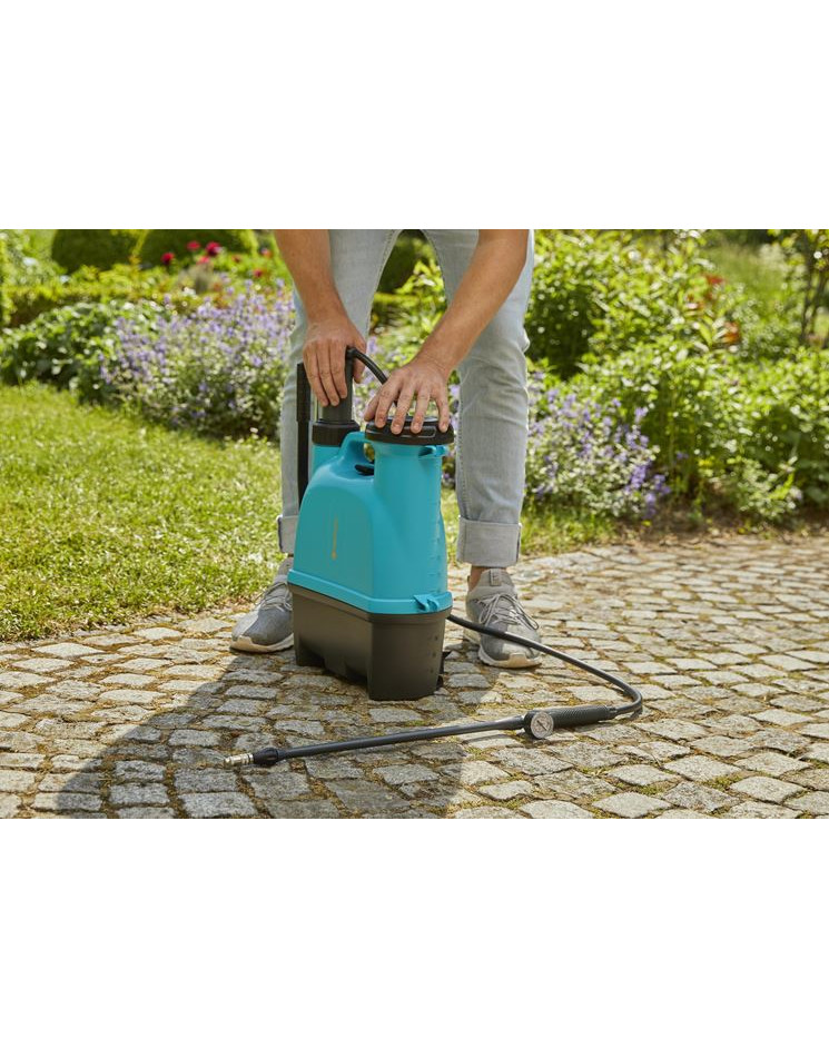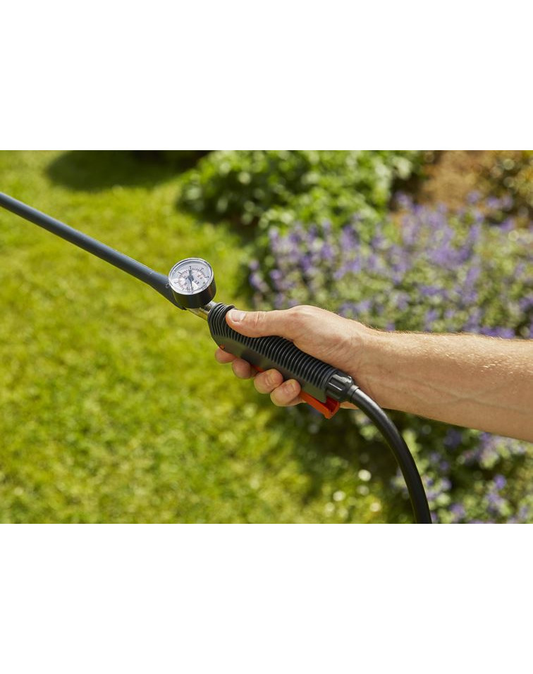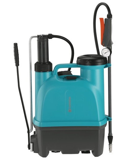 Pulvérisateur à dos avec un récipient contenant 12 litres de liquides d'entretien de jardin. Contrôle facile de la pression à l'intérieur du conteneur grâce à un manomètre.