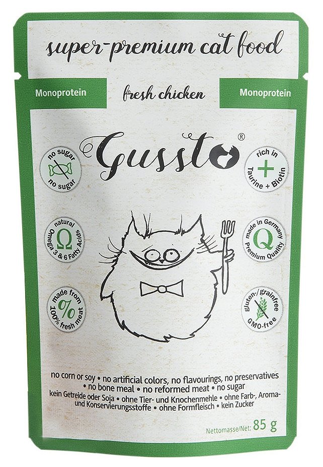 Cette nouriture est fabriquée à partir d'ingrédients de la plus haute qualité et contiennent 70 % de viande saine et d'abats de poulet. Grâce à sa composition simple, les besoins nutritionnels des chats en tant qu'espèce sont entièrement couverts. Ce produit ne contient pas de céréales ni d'autres ingrédients intolérés par les chats. Le bouillon propriétaire de la viande augmente l'appétence et donne à la nourriture une texture caractéristique dont les chats raffolent. L'huile de chardon augmente le caractère gras, de sorte que même les chats difficiles l'apprécieront.