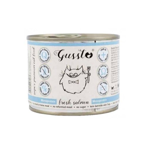 La teneur élevée en viande est responsable d'une bonne digestion et d'une bonne condition physique. Le saumon contient une forte proportion d'acides gras insaturés oméga-3 et -6, qui améliorent l'état du pelage et de la peau du chat.