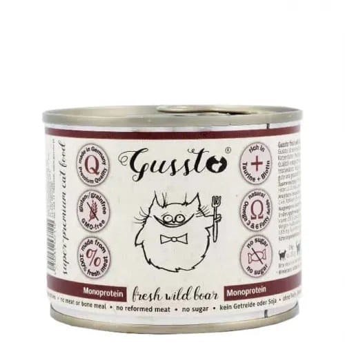 La teneur élevée en viande est responsable d'une bonne digestion et d'une bonne condition physique. La viande de sanglier, comme la viande de gibier, présente un très bon profil d'acides aminés, une teneur élevée en fer et d'autres minéraux précieux. Il est très apprécié des chats.