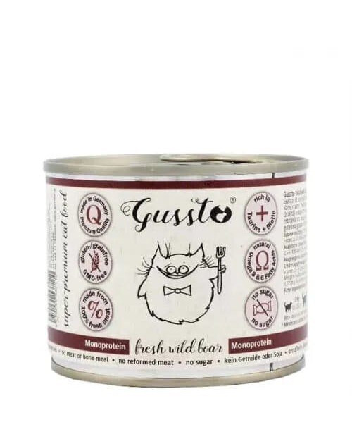70% de sanglier (dont environ 2/3 de viande musculaire et de cœur, environ 1/3 de foie et de poumons), 28,8% de bouillon de viande propre, 1% de minéraux, 0,2% d'huile de chardon.