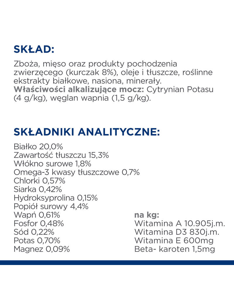 COMPOSITION : céréales, viande et ingrédients animaux (poulet 8%), huiles et graisses, extraits de protéines végétales, graines, minéraux. Substances alcalinisantes de l'urine : citrate de potassium (4 g/kg), carbonate de calcium (1,5 g/kg).