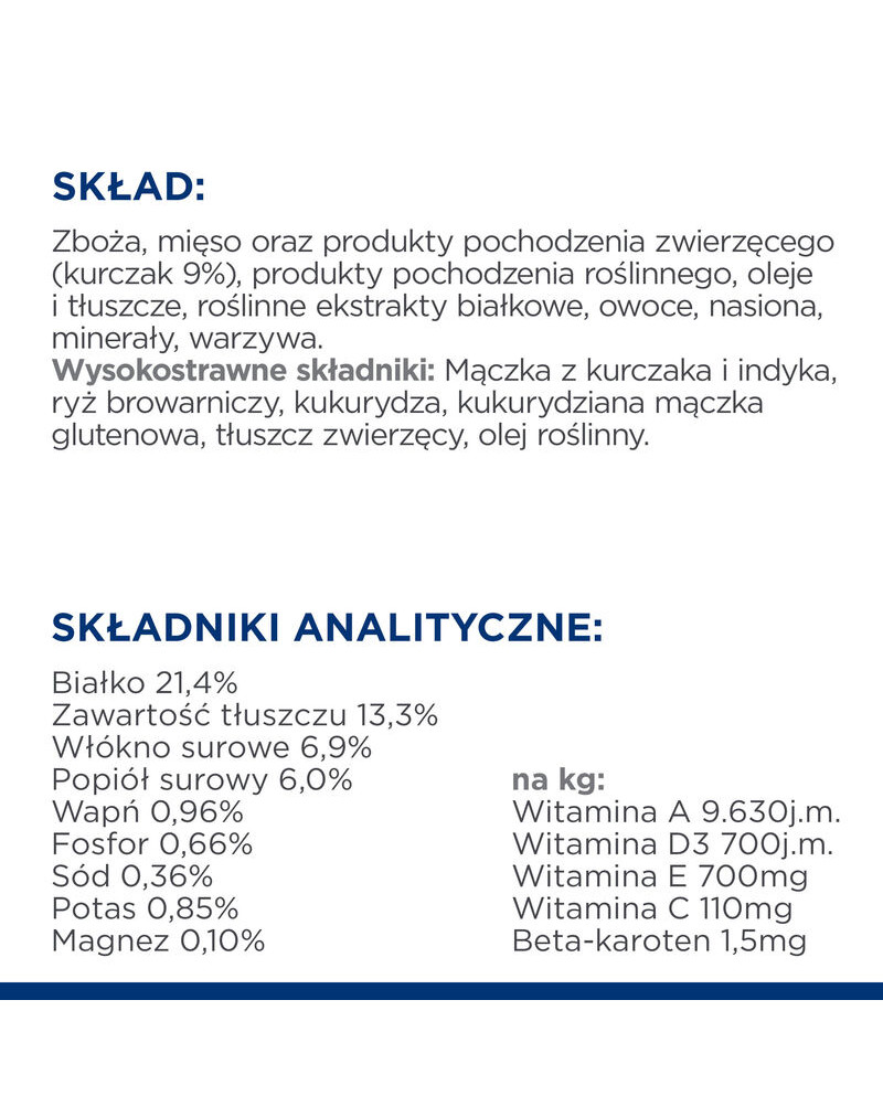 COMPOSITION : céréales, viande et ingrédients animaux (poulet 9%), ingrédients végétaux, huiles et graisses, extraits de protéines végétales, fruits, graines, minéraux, légumes. Ingrédients hautement digestibles : farine de poulet et de dinde, riz de brasserie, maïs, farine de gluten de maïs, graisse animale, huile végétale.
