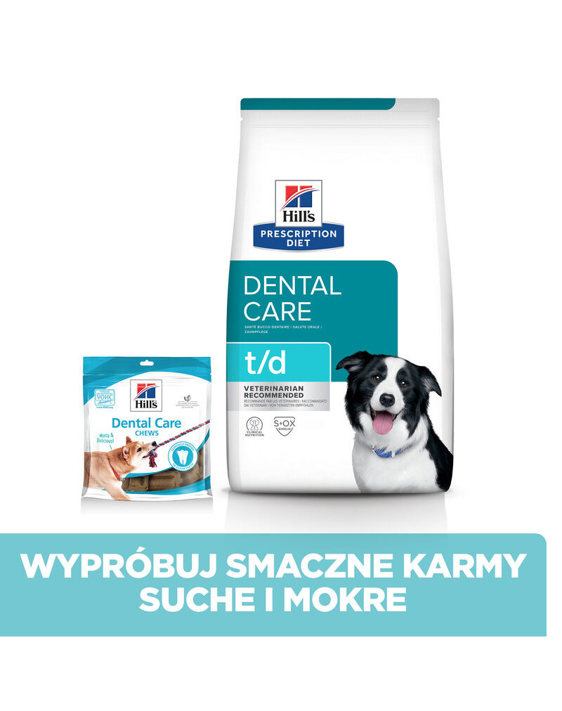 Les croquettes pour chien Hill's PRESCRIPTION DIET t/d avec poulet sont des aliments complets pour chiens adultes utilisant une technologie dentaire cliniquement prouvée.