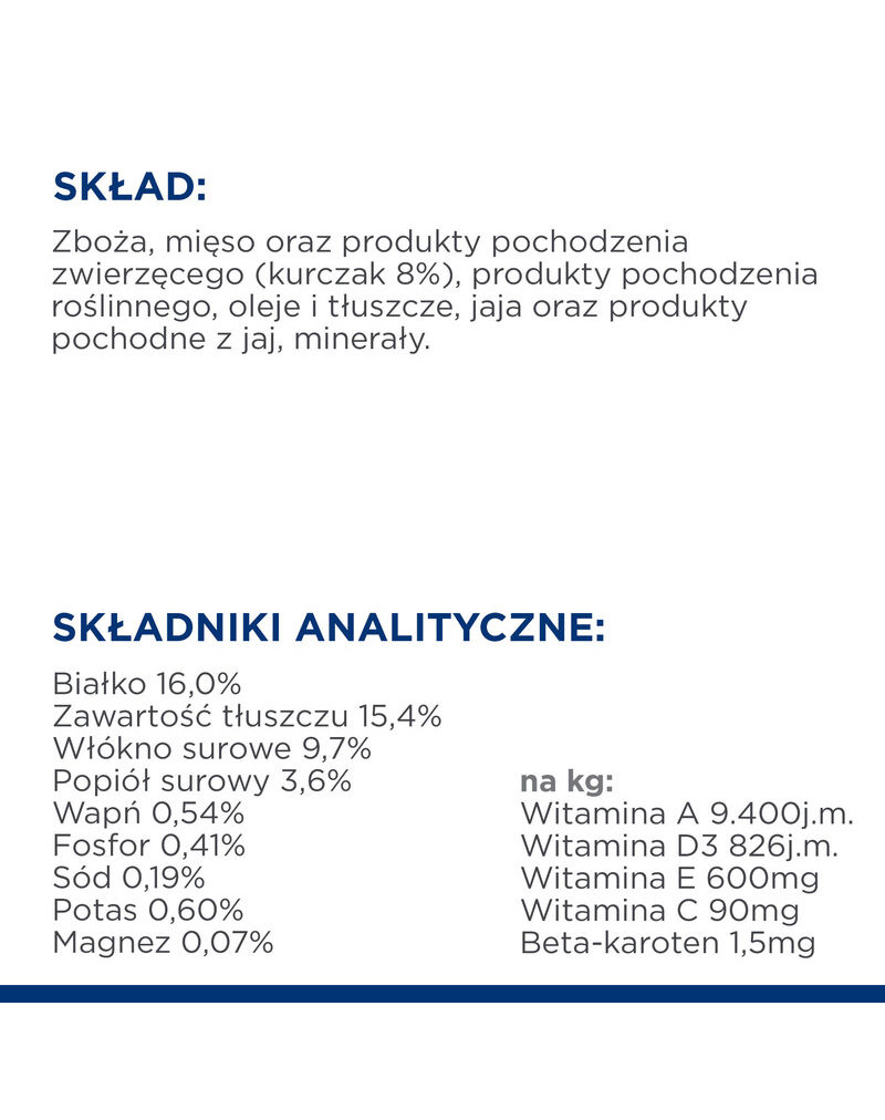 INGRÉDIENTS : protéines 16,0%, matières grasses 15,4%, fibres brutes 9,7%, cendres brutes 3,6%, calcium 0,54%, phosphore 0,41%, sodium 0,19%, potassium 0,60%, magnésium 0,07% ; par kg : vitamine A 9.400 UI, vitamine D3 826 UI, vitamine E 600 mg, vitamine C 90 mg, bêta-carotène 1,5 mg.