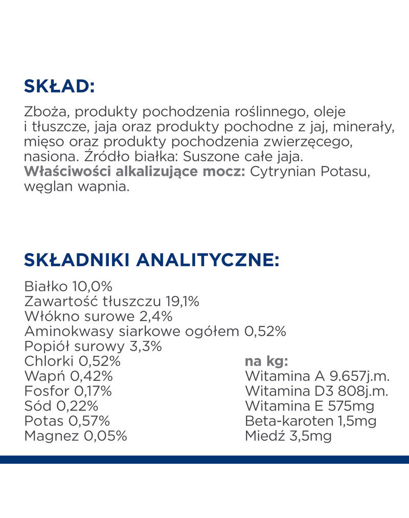 COMPOSITION: Riz de brasserie, amidon de maïs, maïs complet, graisse de poulet, produit d'œuf, graines de lin, protéines de pomme de terre, arôme de foie de poulet, acide lactique, carbonate de calcium, citrate de potassium, phosphate bicalcique, L-lysine, sel iodé, vitamines (supplément de vitamine E, supplément de niacine, mononitrate de thiamine, chlorhydrate de pyridoxine, pantothénate de calcium), Supplément de riboflavine, biotine, supplément de vitamine B12, supplément de vitamine A, acide folique, supplément de vitamine D3), chlorure de potassium, DL-Méthionine, chlorure de choline, taurine, oxyde de magnésium, Minéraux (oxyde de zinc, sulfate de fer, sulfate de cuivre, oxyde de manganèse, iodate de calcium, sélénite de sodium), L-carnitine, mélange de tocophérols pour la fraîcheur, arômes naturels, bêta-carotène.