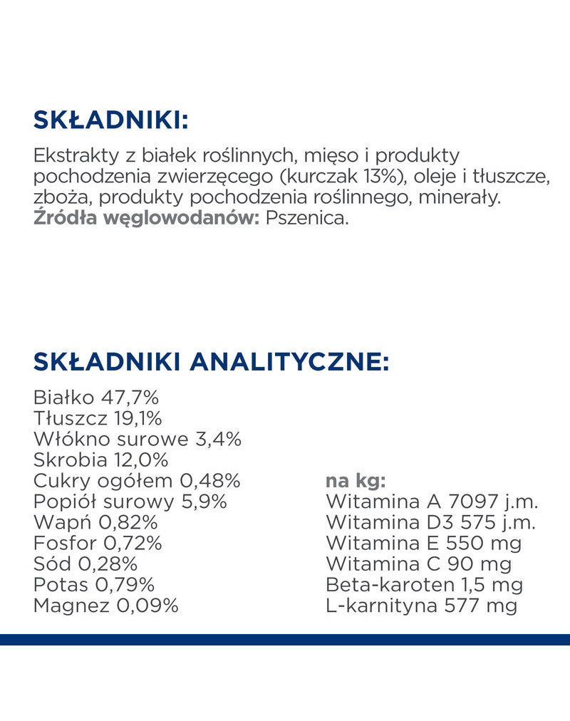 INGRÉDIENTS: protéines 47,7 %, graisses 19,1 %, fibres brutes 3,4 %, amidon 12,0 %, sucres totaux 0,48 %, cendres brutes 5,9 %, calcium 0,82 %, phosphore 0,72 %, sodium 0,28 %, potassium 0,79 %, magnésium 0,09 % ; par kg : vitamine A 7. 097 UI, vitamine D3 575 UI, vitamine E 550 mg, vitamine C 90 mg, bêta-carotène 1,5 mg, L-carnitine 577 mg.