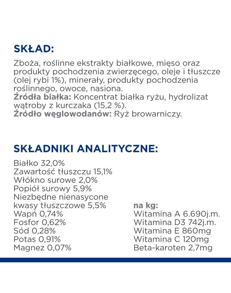 COMPOSITION: Céréales, extraits de protéines végétales, viande et sous-produits animaux, huiles et graisses (1 % d'huile de poisson), minéraux, sous-produits végétaux, fruits, graines. Sources de protéines : concentré de protéines de riz, hydrolysat de foie de poulet (15,1%). Source de glucides : riz de brasserie.