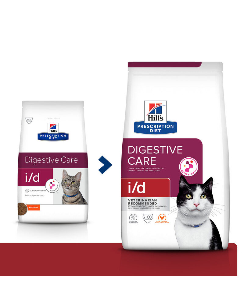 La nourriture sèche pour chat Hill's PRESCRIPTION DIET i/d au poulet sont des nourritures diététiques completes et hautement assimilables conçues pour réduire les symptômes de la mauvaise assimilation intestinale, pour compenser les effets d'une mauvaise digestion et d'une insuffisance pancréatique exocrine chez le chat.