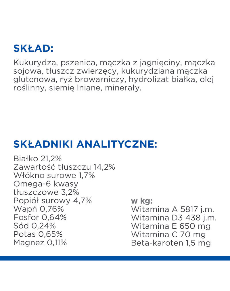 INGRÉDIENTS : Maïs, blé, farine d'agneau, farine de soja, graisse animale, farine de gluten de maïs, riz de brasserie, hydrolysat de protéines, huile végétale, graines de lin, minéraux. Protéines brutes 21,2 % , Graisses brutes 14,2 % , Fibres brutes 1,7 % , Cendres brutes 4,7 % , Calcium 0.76 % , Phosphore 0,64 % , Magnésium 0,11 %Bêta-carotène
