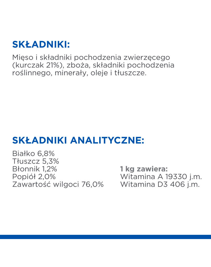 INGRÉDIENTS ANALYTIQUES : Protéines 6,8%, Matières grasses 5,3%, Fibres brutes 1,2%, Cendres brutes 2,0%, Humidité 76,0%, par kg : Vitamine A 19 330IU, Vitamine D3 406IU.