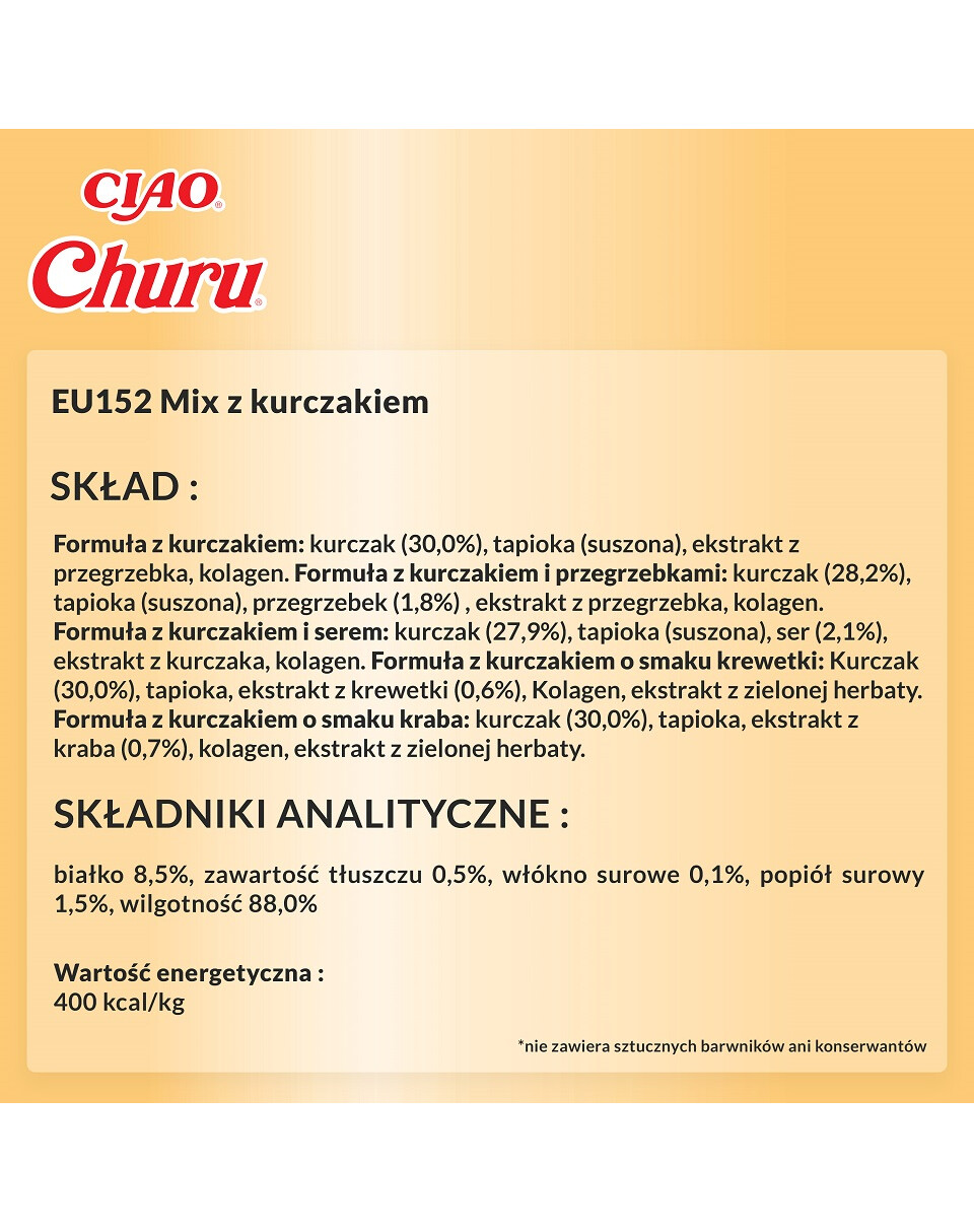 Formule poulet aromatisé aux crevettes : Poulet (30,0%), Tapioca, Extrait de crevettes (0,6%), Collagène, Extrait de thé vert. Additifs pour 1 kg : Additifs technologiques : gomme de guar (E412) 7,2 g. Additifs sensoriels : arômes. Additifs diététiques : vitamine E (3a700) 574 mg.