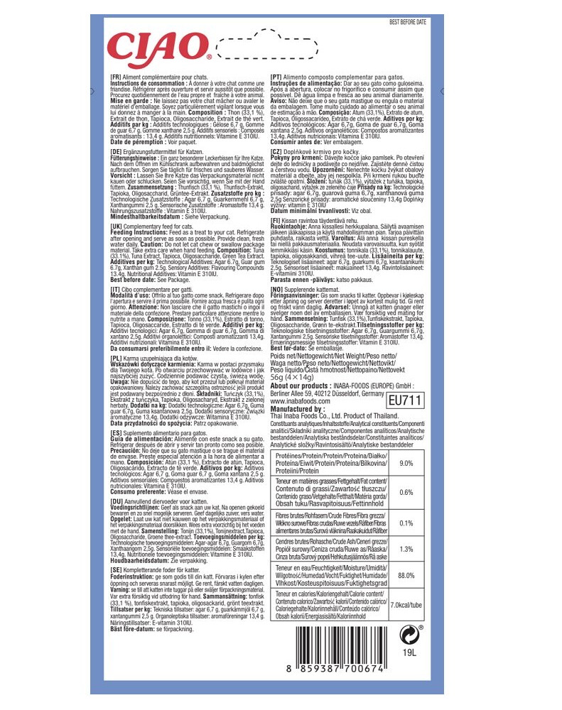 INGRÉDIENTS: thon 33,3%, extrait de thon, extrait de thé vert. Additifs technologiques par kg : agar 6,7 g, gomme guar 6,7 g, gomme xanthane 1,7 g.