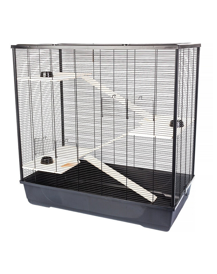 Une cage haute et spacieuse pour les rongeurs. Les étages sont en bois, avec des échelles en bois qui permettent d'accéder à chacun d'entre eux, en toute sécurité pour les animaux. La cage s'ouvre par le haut et est en outre fermée par des boutons-pression, ce qui garantit la sécurité et, en même temps, la facilité de sortie de l'animal. La largeur entre les fils est adaptée aux rongeurs, ce qui empêche les fuites éventuelles. Le bac à litière profond permet de jouer, de creuser, de créer des tunnels dans la sciure de bois, sans la répandre dans la cage.