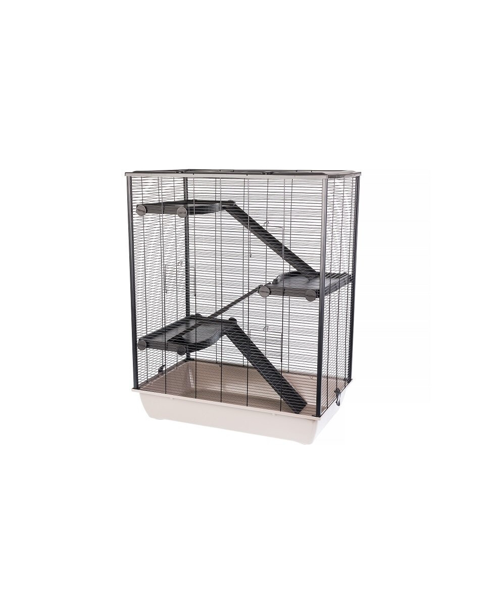 Une cage très spacieuse, adaptée aux besoins des petits animaux. Trois niveaux, reliés par des échelles, permettent aux rongeurs de se déplacer en toute sécurité. Les sols et les échelles sont faciles à assembler, robustes et rapides à nettoyer. La cage est équipée d'un bac à litière profond en plastique pour éviter que la sciure et les déchets ne se répandent à l'extérieur de la cage.