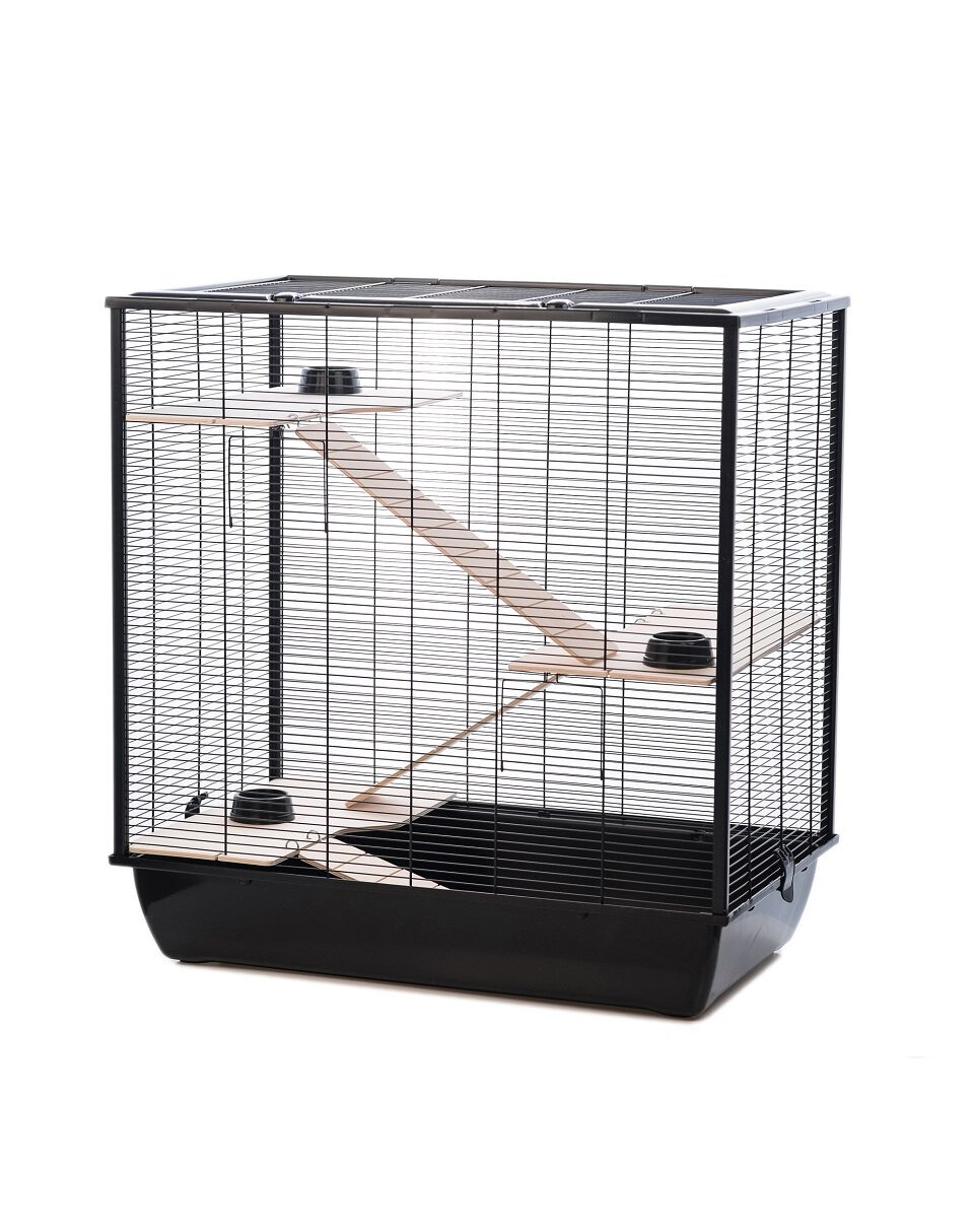 La cage est stable et spacieuse. Le bac à litière profond empêche la sciure de bois ou tout autre substrat de se répandre dans la cage et permet à l'animal de creuser et de se terrer librement. Le mobilier est en bois, les étagères et les échelles ont été conçues pour assurer un passage sûr au rongeur.