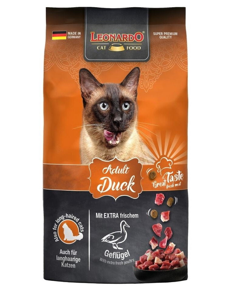 LEONARDO Adult Duck & Rice est une nourriture sèche pour chats adultes avec du canard et du riz (à partir de l'âge d'un an).
