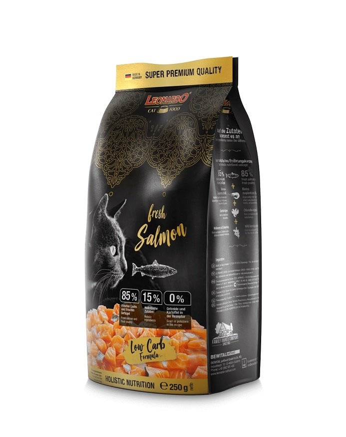 Composition: saumon frais (43%) ; viande de volaille fraîche (42%) ; farine de pois ; amarante ; zooplancton marin, broyé (krill, 1,7%) ; oeuf séché ; farine de poisson marin, séchée, hydrolysée ; foie de volaille, hydrolysé ; graines de chia ; levure de bière, séchée (0,4%, source de bêta-glucanes et de mannanooligosaccharides) ; pain de caroube, moulu ; pulpe de pomme, séchée ; légumes secs (carottes, panais, betteraves, poireaux) ; algues séchées (0,18%, chlorella vulgaris) ; phosphate bicalcique ; chlorure de potassium ; baies forestières séchées (total : 0,07% ; sorbier, églantier, myrtille, sureau, groseille) ; canneberges (0,07%) ; herbes séchées (feuilles d'ortie, racine de gentiane, centaurée, camomille, fenouil, carvi, gui, achillée, feuilles de mûre) ; extrait d'olive (olea europaea).