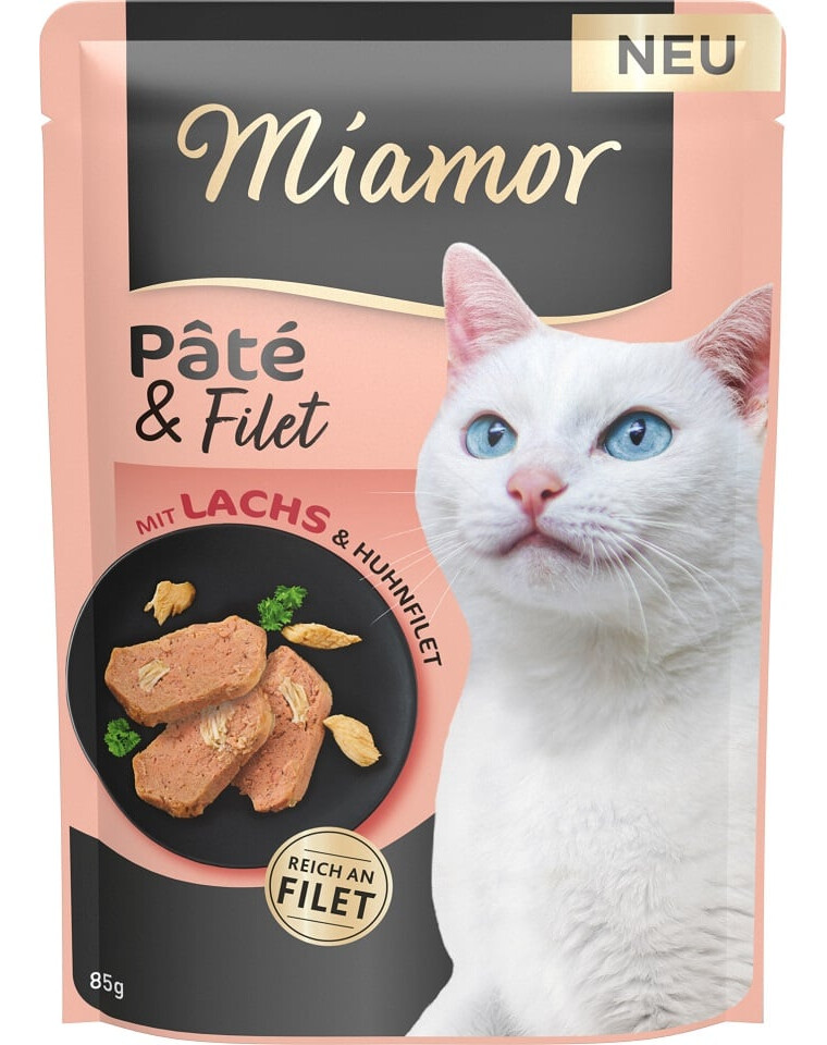 Miamor Pate & Filet - exclusivement de la viande pure et des abats de la plus haute qualité. Complété par des morceaux de filets de poulet visibles et de haute qualité, il constitue une portion alléchante de nourriture pour le bien-être quotidien des chats exigeants. Les viandes utilisées sont une source précieuse de protéines, de vitamine D et de taurine. Recette sans céréales, sans gluten et sans sucre, sans colorants ni conservateurs.