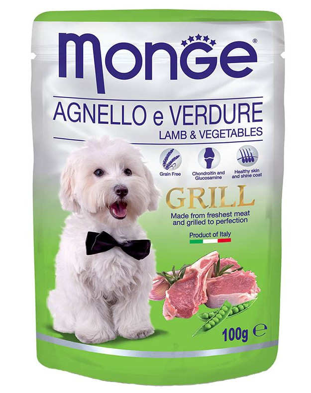 Aliment humide complet pour chiens, formulé à base de viande d'agneau parfaitement grillée, additionnée de légumes. Contient de la chondroïtine et de la glucosamine nécessaires au bon développement des articulations. Grâce aux produits Monge Grill, votre chien aura un poil magnifique et brillant. Il s'agit d'un produit sans céréales.