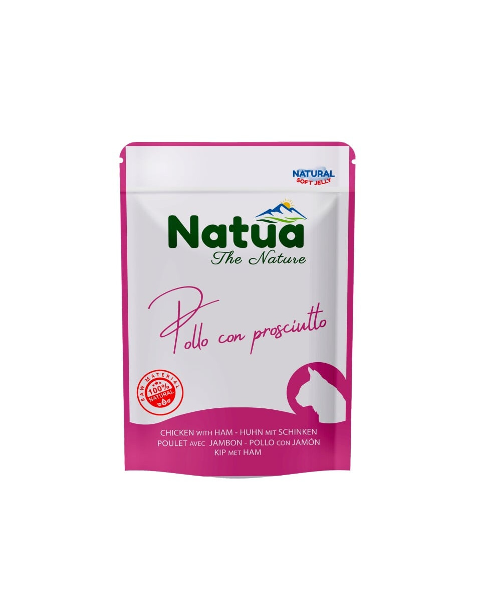 Natua Poulet Naturel avec Jambon est un aliment humide complémentaire délicat conçu pour les chats adultes. La recette repose sur une haute teneur en poulet (62%) avec l'ajout de jambon (4%), ce qui confère au produit un goût naturel et une bonne digestibilité.
