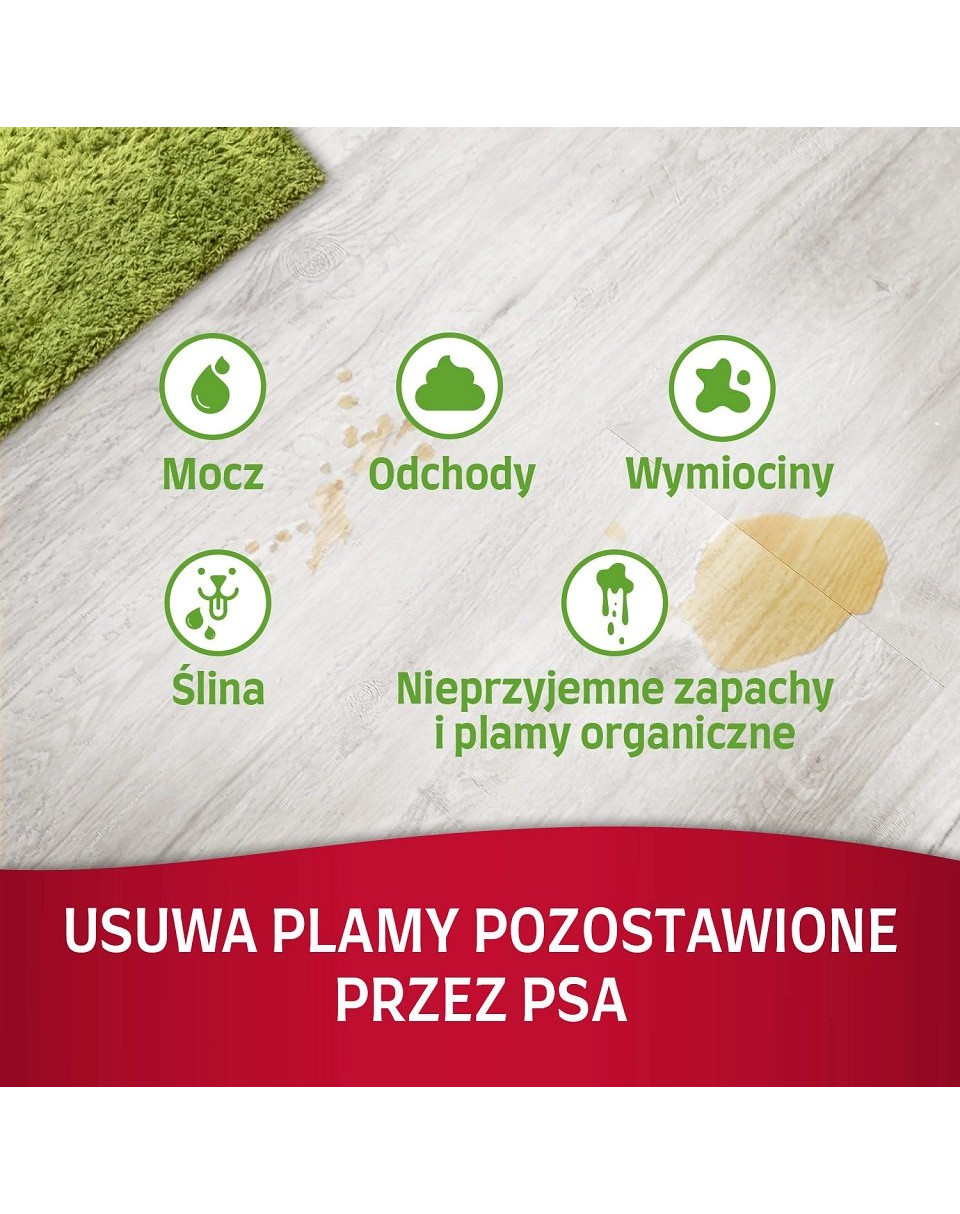 Dissolvant de taches et d'odeurs : nettoyez la tache du mieux que vous pouvez, puis imbibez soigneusement la zone souillée avec le produit. Le trempage est important car il permet au produit de pénétrer plus profondément. Laissez agir pendant 15 minutes, puis séchez la tache avec un chiffon propre.