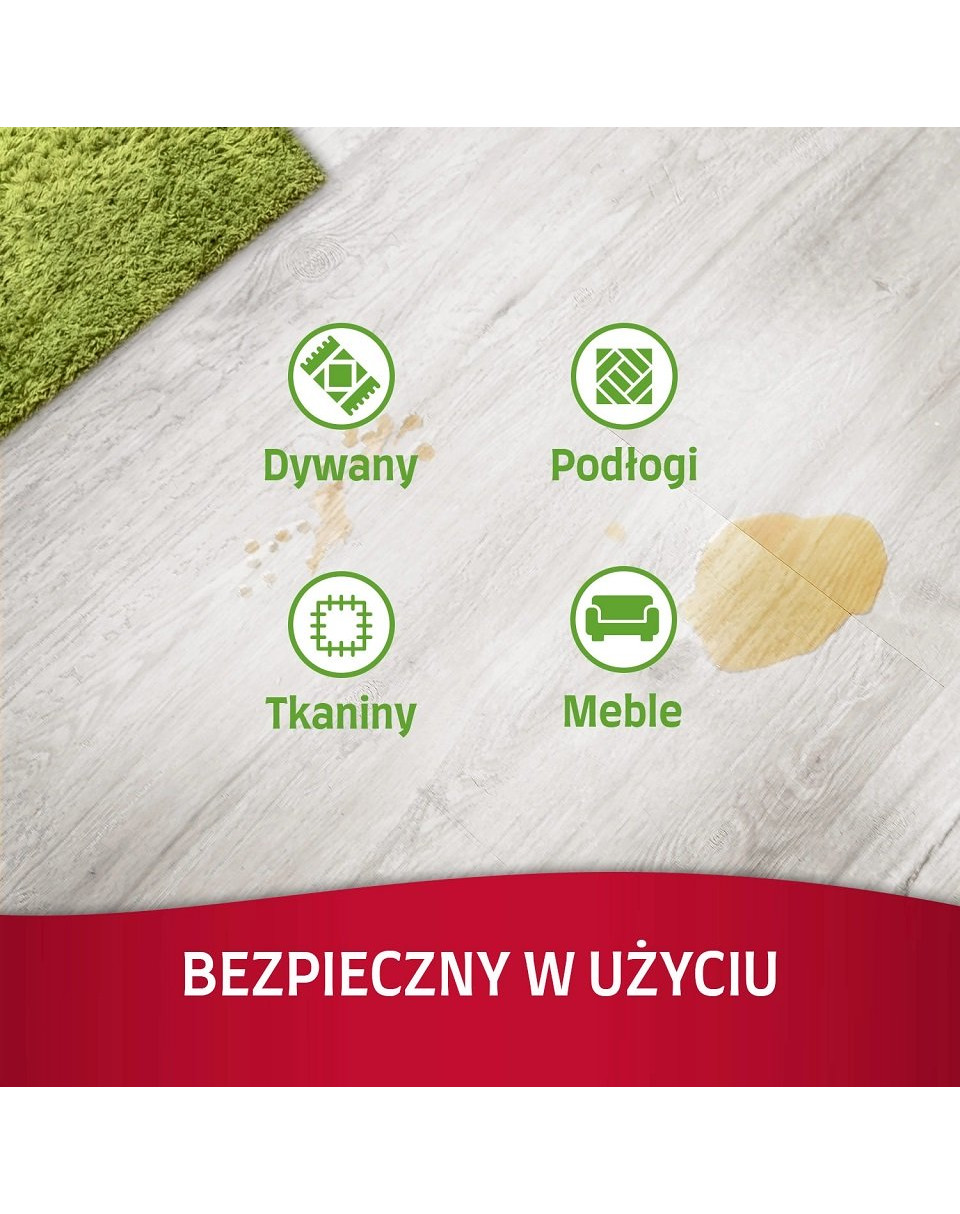 Dissolvant de taches et d'odeurs : nettoyez la tache du mieux que vous pouvez, puis imbibez soigneusement la zone souillée avec le produit. Le trempage est important car il permet au produit de pénétrer plus profondément. Laissez agir pendant 15 minutes, puis séchez la tache avec un chiffon propre.