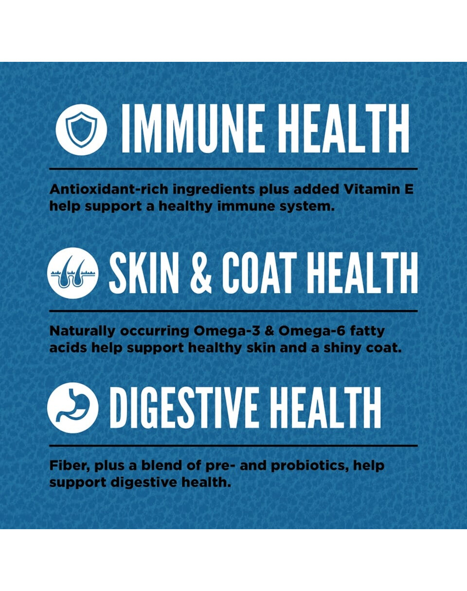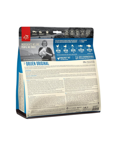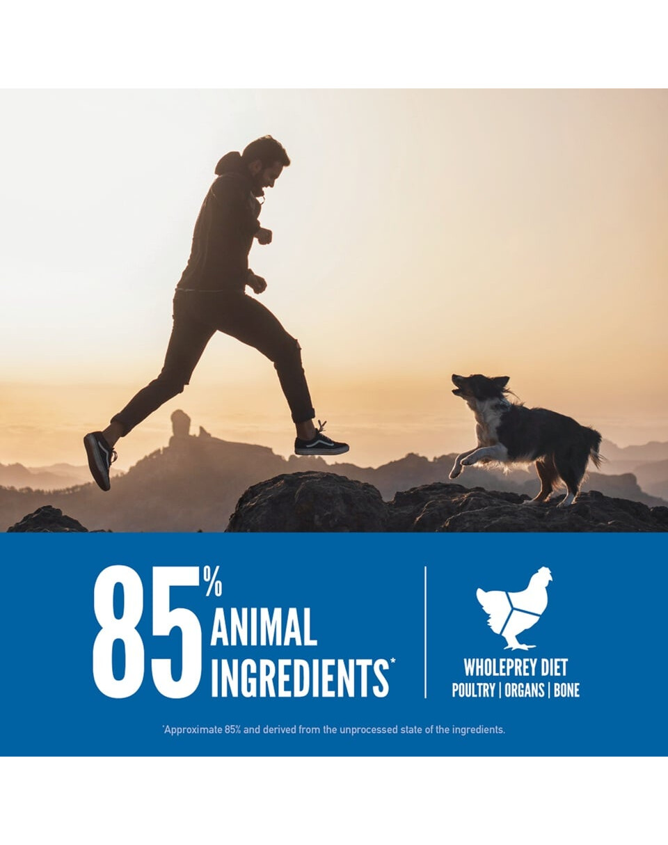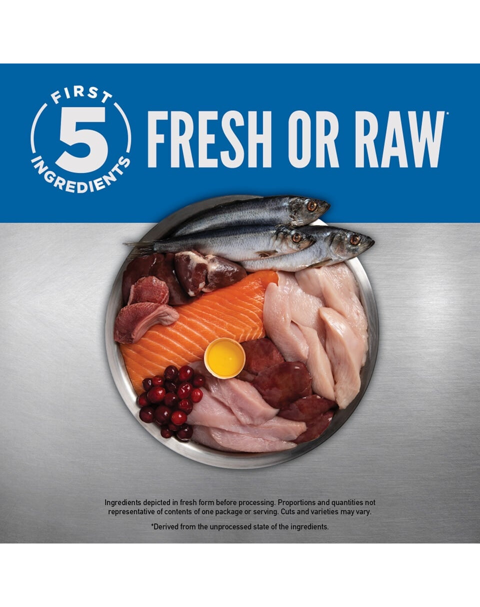 Viande de poulet fraîche (13%), viande de dinde fraîche (7%), œufs entiers frais (7%), foie de poulet frais (6%), hareng entier frais (6%), flet entier frais (5%), foie de dinde frais (5%), cou de poulet frais (4%), cœur de poulet frais (4%), cœur de dinde frais (4%), poulet (déshydraté, 4%), dinde (déshydratée, 4%), maquereau entier (déshydraté, 4%), sardines entières (déshydratées, 4%), hareng entier (déshydraté, 4%), lentilles rouges entières, lentilles vertes entières, pois verts entiers, fibres de lentilles, pois chiches entiers, pois jaunes entiers, haricots pinto entiers, haricots blancs entiers, huile de hareng (1 %), graisse de poulet (1 %), cartilage de poulet (1 %), foie de poulet (lyophilisé), foie de dinde (lyophilisé), citrouille fraîche entière, melon musqué frais entier, courgette fraîche entière, panais frais entier, carottes fraîches, pommes red delicious fraîches entières, poires bartlett fraîches entières, chou frisé frais, épinards frais, feuilles de betterave fraîche, feuilles de navet frais, varech brun, airelles rouges entières, myrtilles entières, baies d'amélanchier entières, racine de chicorée, curcuma, chardon marie, racine de bardane, fleur de lavande, racine de valériane, cynorrhodon.