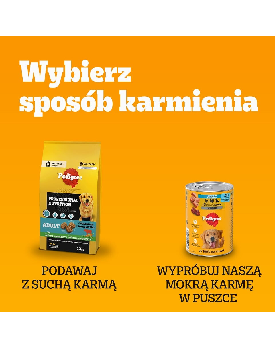 PEDIGREE Adult Vitality+ z warzywami saszetki 4x85 g mokra karma pełnoporcjowa dla dorosłych psów z wołowiną i wątróbką, marchewką i groszkiem, z kurczakiem i ziemniakami, z rybą i marchewką, z drobiem, marchewką i groszkiem w sosie