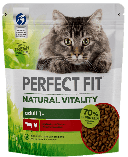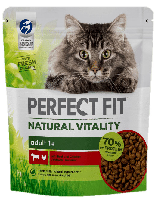 PERFECT FIT Natural Vitality 1+ sucha karma pełnoporcjowa dla dorosłych kotów z wołowiną i kurczakiem 6x650 g