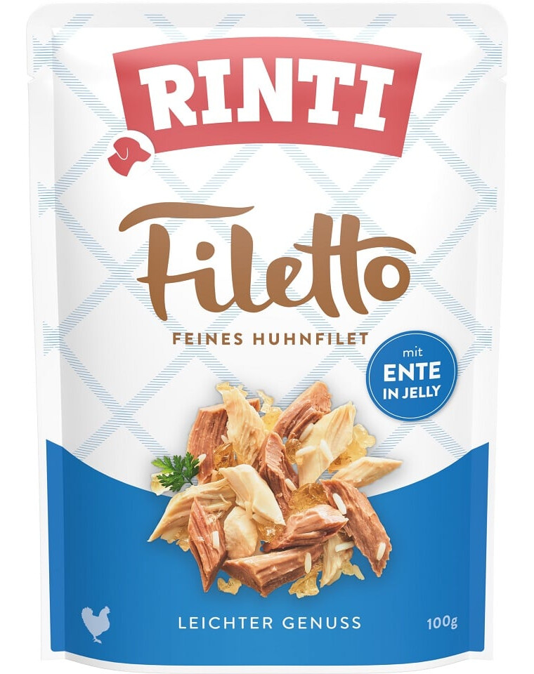 RINTI Filetto est une nourriture complémentaire à base de poulet et de canard en gelée aromatique pour les chiens adultes de toutes races.