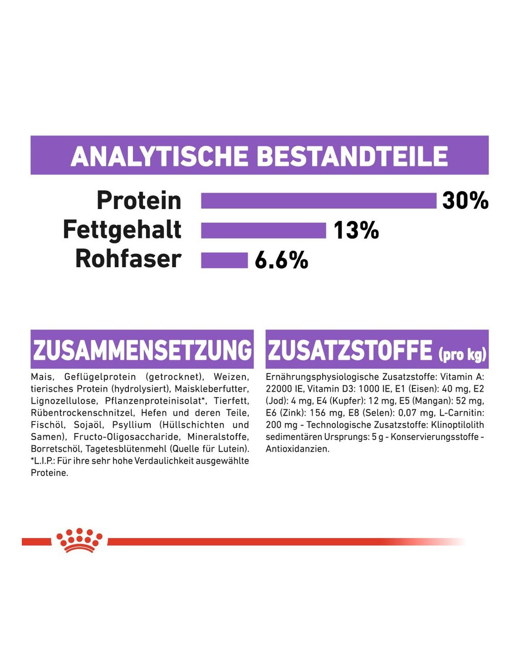 maïs, protéines de volaille (déshydratées), blé, protéines animales (hydrolysées), gluten de maïs, lignocellulose, isolat de protéines végétales*, graisse animale, pulpe de betteraves déshydratées, levures et composants de levures, huile de poisson, huile de soja, psyllium (graines et téguments), fructo-oligosaccharides, minéraux, huile de bourrache, extrait de rose d'Inde (soure de lutéine).