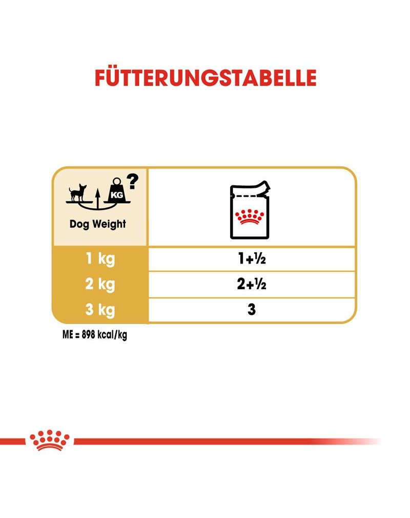En tenant compte des préférences alimentaires des chiens, les aliments ROYAL CANIN® Chihuahua sont également disponibles sous forme sèche, sous forme de croquettes savoureuses. Lorsque vous donnez des aliments secs et humides, veuillez vous référer au tableau de dosage pour sélectionner la portion correcte de chaque aliment.