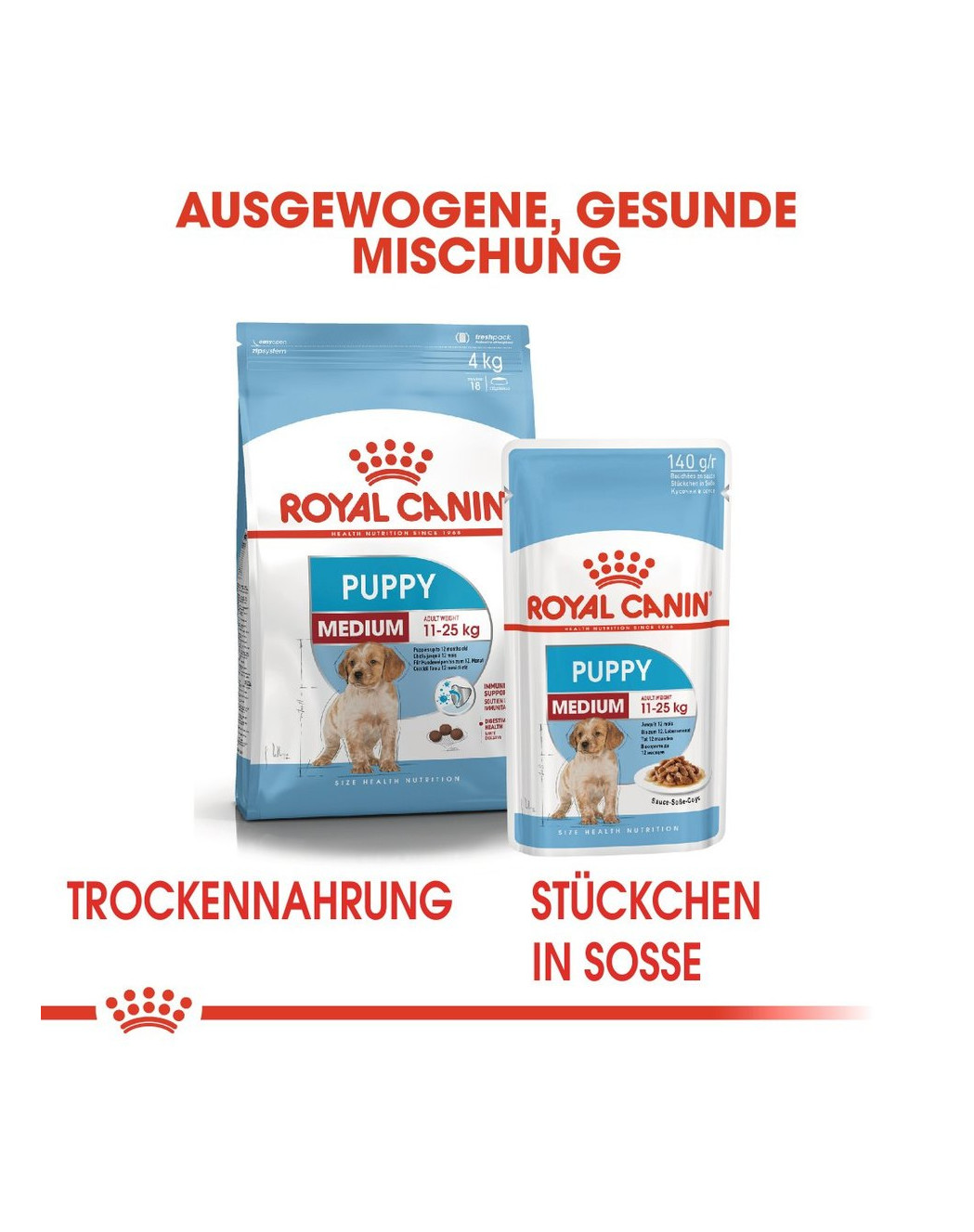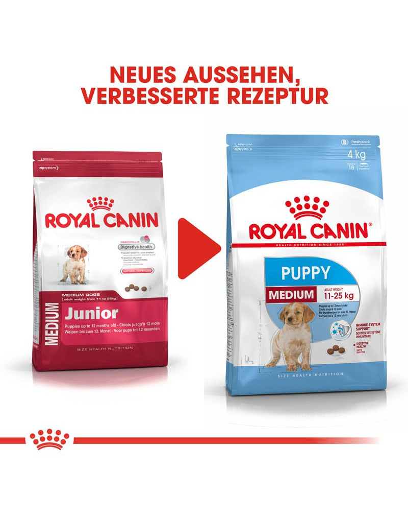 ROYAL CANIN® Medium Puppy convient aux chiots de taille moyenne âgés de 2 à 12 mois, dont le poids adulte sera compris entre 11 et 25 kg.