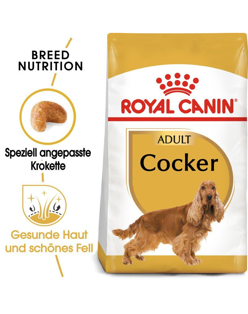 ROYAL CANIN® Cocker Adult est spécialement formulé pour répondre à tous les besoins nutritionnels de votre chien et convient aux Cockers anglais de plus de 12 mois.