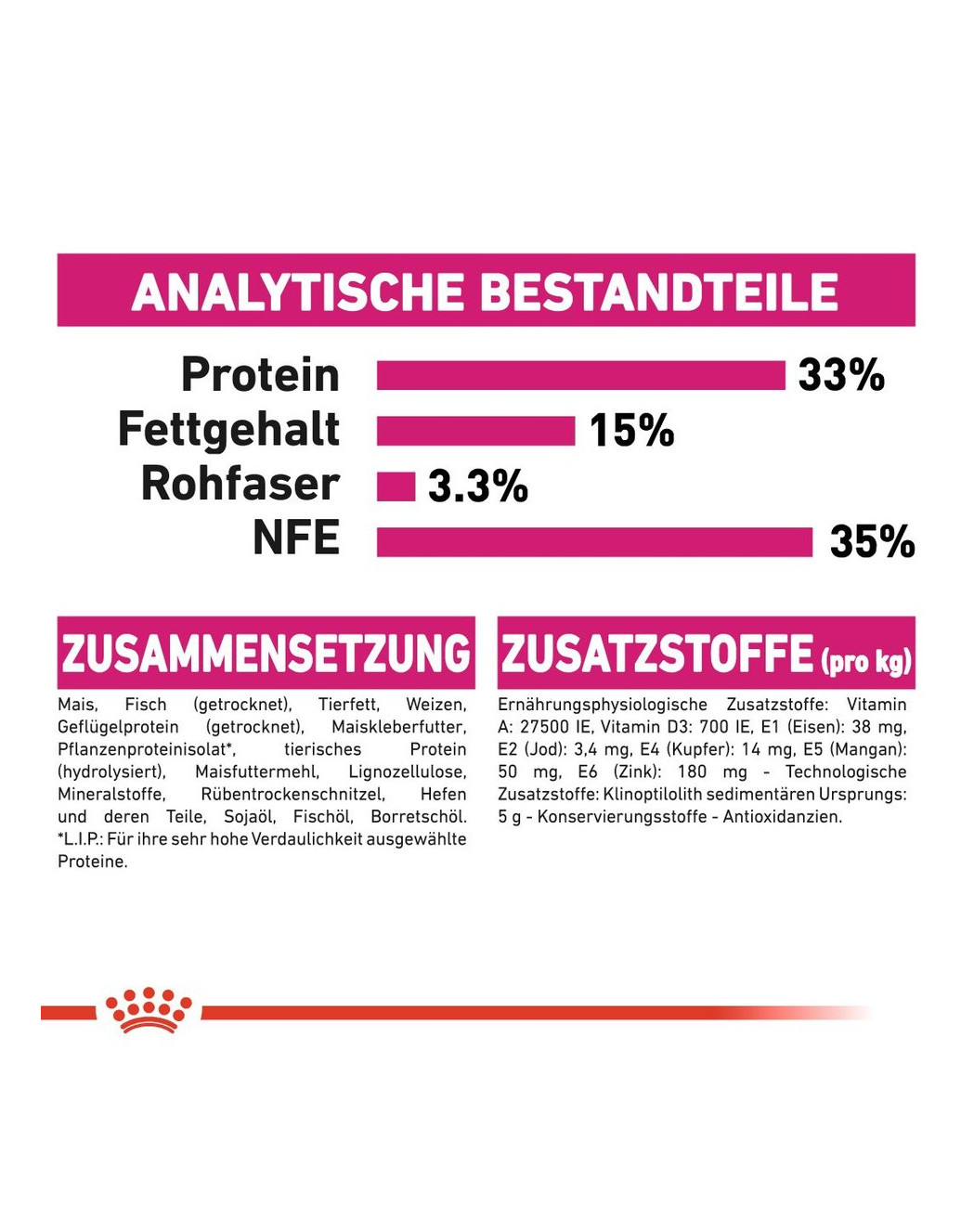 Constituants analytiques : Protéine : 33 % - Teneur en matières grasses : 15 % - Cendres brutes : 8,2 % - Cellulose brute : 3,3 %.