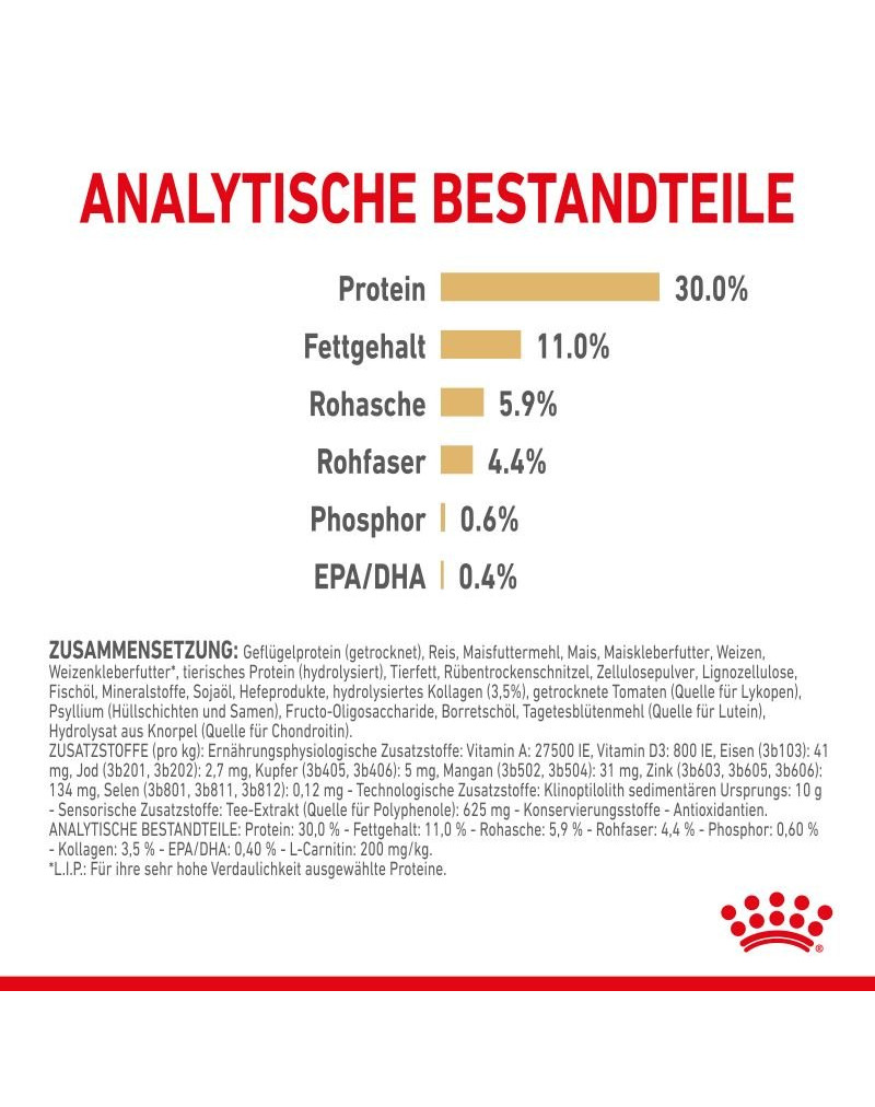 COMPOSITION : protéines de volaille séchées, riz, farine de maïs, maïs, gluten de maïs, blé, gluten de blé*, protéines animales hydrolysées, graisses animales, pulpe de betterave, cellulose en poudre, fibres végétales, huile de poisson, minéraux, huile de soja, produits de levure, collagène hydrolysé (3,5%), pulpe de tomate séchée (source de lycopène), enveloppes et graines de psyllium, fructooligosaccharides, huile de bourrache, extrait de souci (source de lutéine), hydrolysat de cartilage (source de chondroïtine).