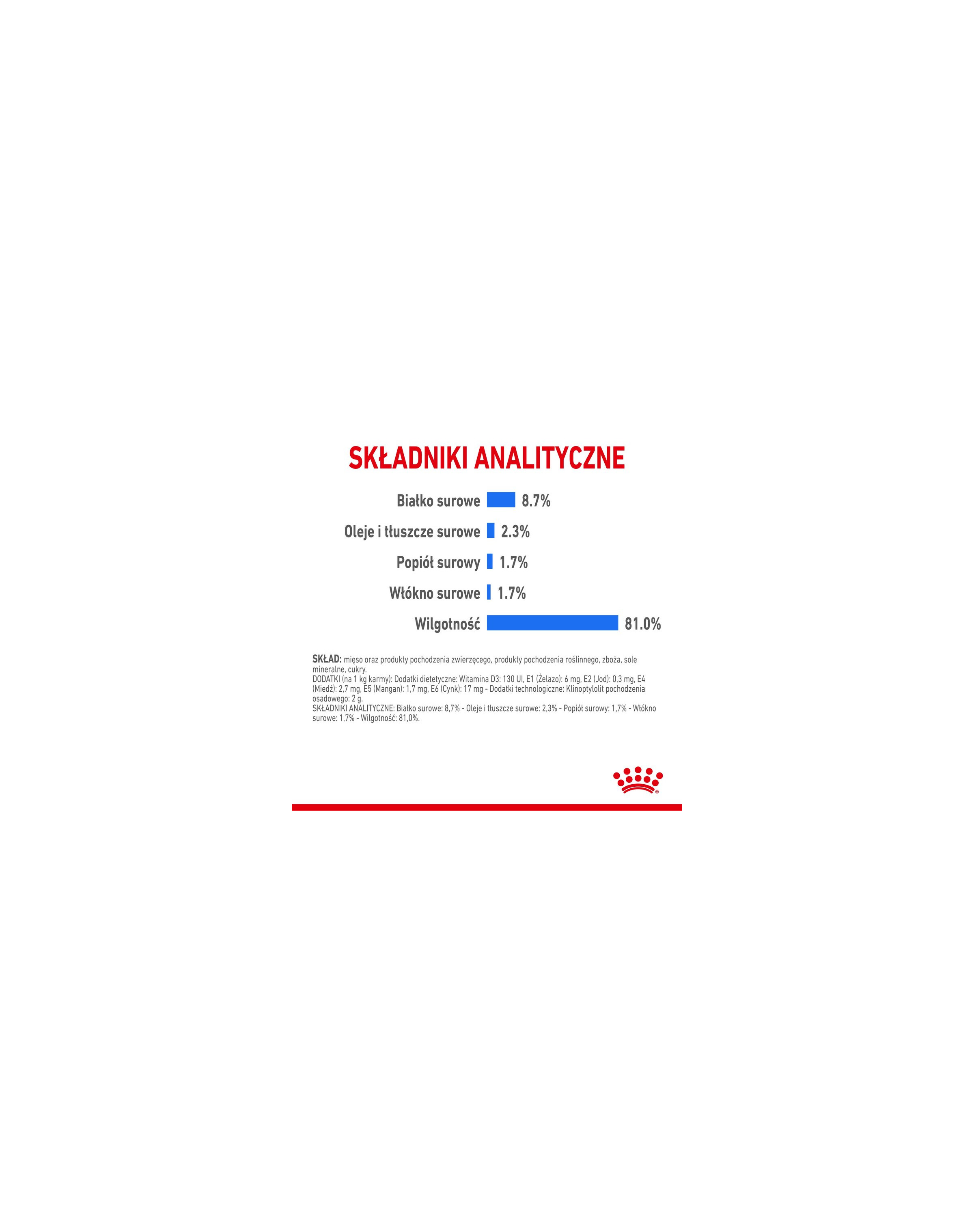 Constituants analytiques : Protéine : 8,7 % - Teneur en matières grasses : 2,3 % - Cendres brutes : 1,7 % - Cellulose brute : 1,7 % - Humidité : 81,0 %.