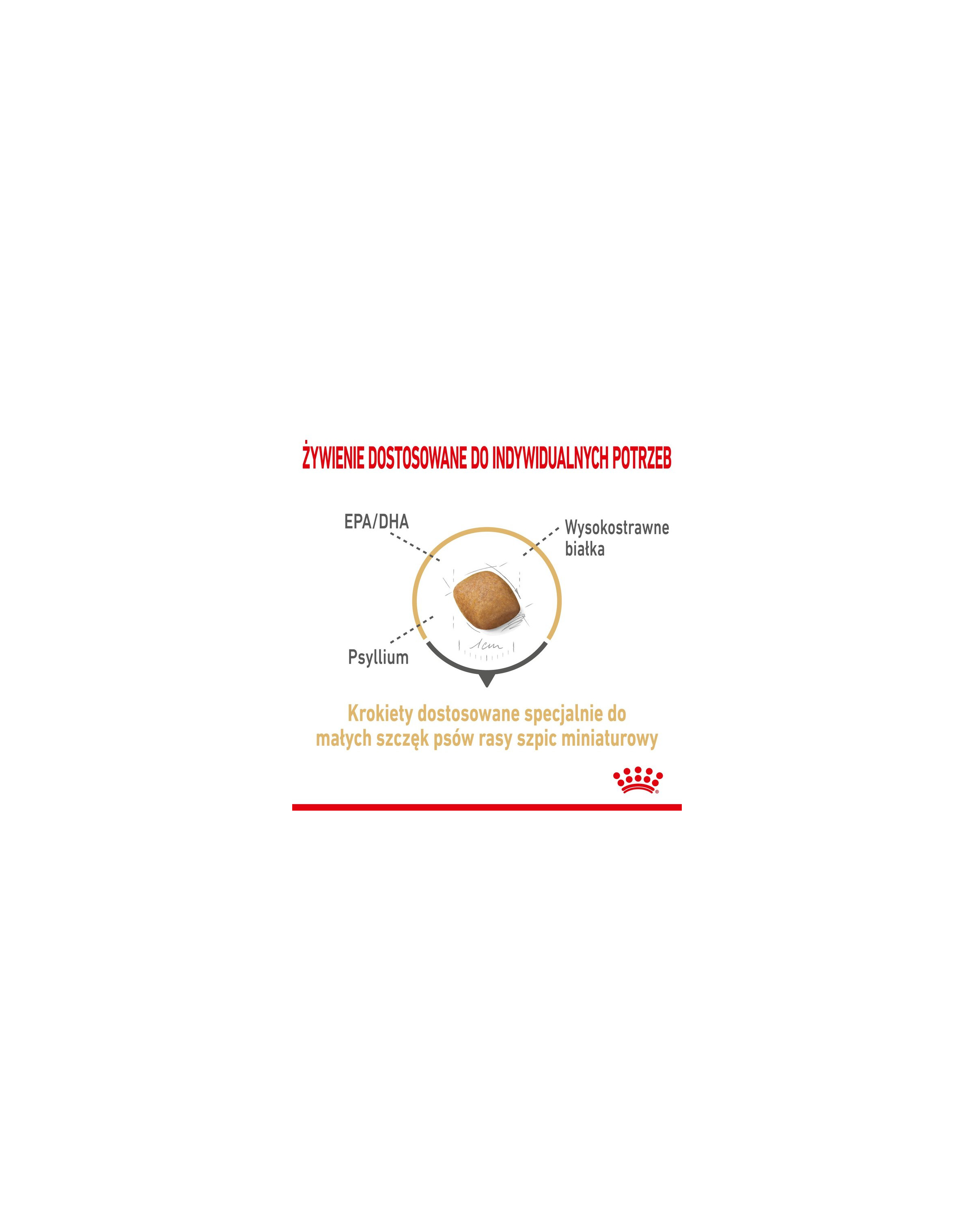 La forme, la taille, la texture et la formule de la croquette ont été adaptées aux besoins et aux petites mâchoires des chiens Spitz nains. Cette recette permet de réduire la formation de tartre grâce à l'utilisation de composés liant le calcium, ce qui favorise l'hygiène buccale.