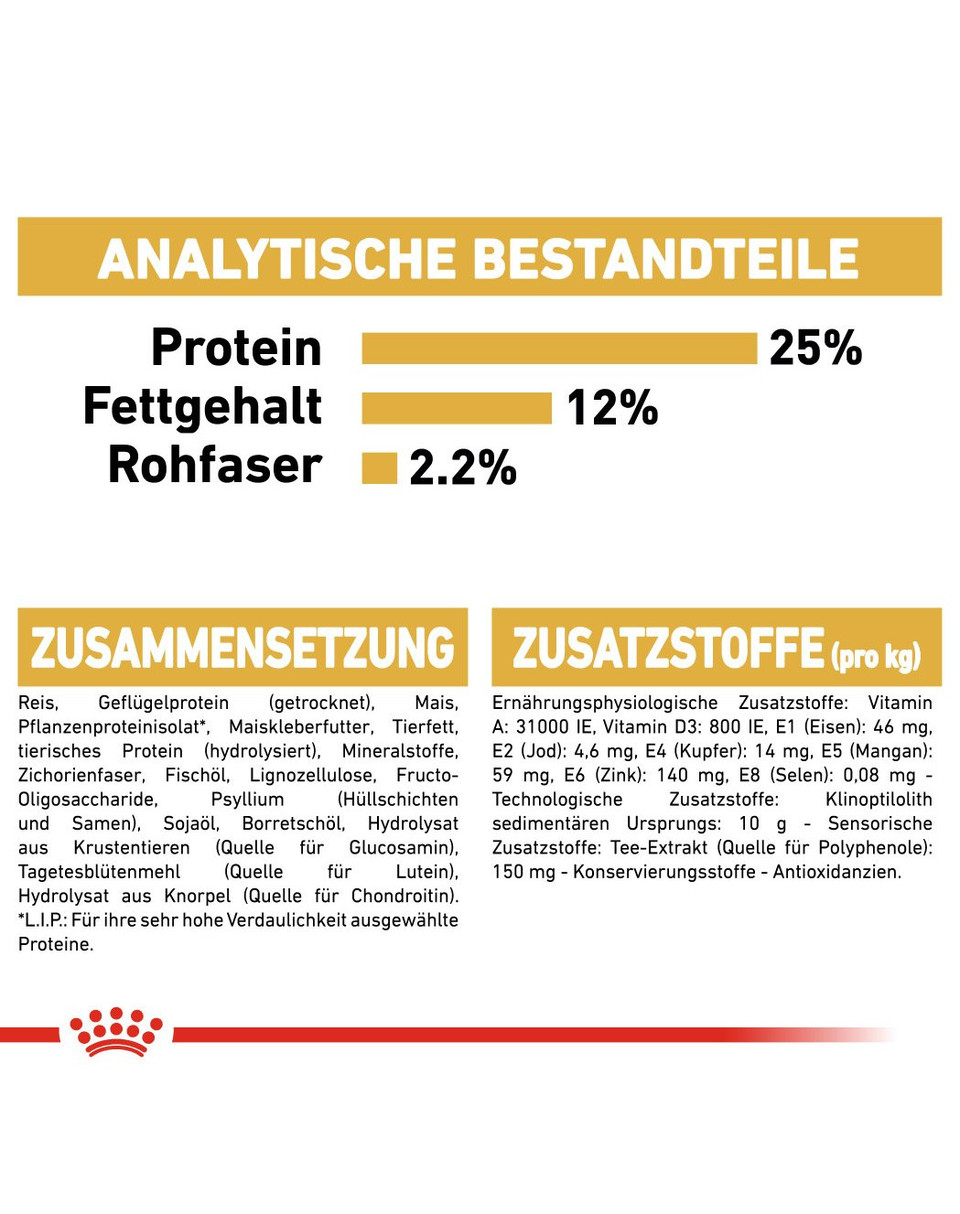 Riz, protéines de volaille séchées, maïs, isolat de protéines végétales*, gluten de maïs, graisses animales, sels minéraux, hydrolysat de protéines animales, pulpe de chicorée, huile de poisson, fibres végétales, enveloppes et graines de psyllium, fructo-oligosacharides, huile de soja, huile de bourrache, extraits de thé vert et de raisin (source de polyphénols), hydrolysat de crustacés (source de glucosamine), extrait de souci (source de lutéine), hydrolysat de cartilage (source de chondroïtine).
