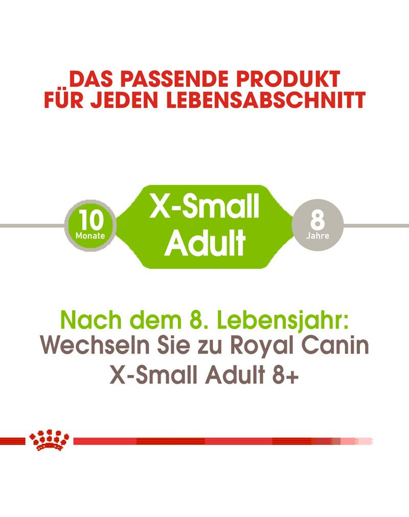 Dans le groupe des petits chiens, on distingue un groupe de chiens dont le poids à l'âge adulte ne dépasse pas 4 kg. Ces très petits chiens sont parfaitement adaptés à l'époque moderne : ils sont aptes à vivre dans de petits espaces, supportent très bien la vie dans les grandes villes, ne posent pas de gros problèmes et sont impatients de jouer avec leur maître. C'est pourquoi Royal Canin a créé pour eux une gamme d'aliments X-Small qui répond à tous les besoins des chiens de très petite race, à chaque étape de leur vie.
