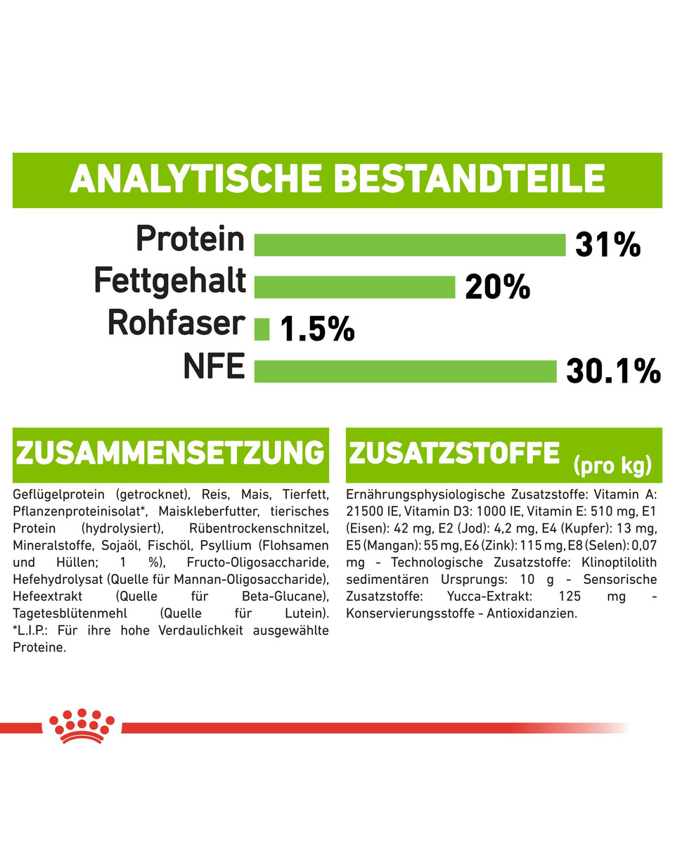 Royal Canin est responsable de la santé des animaux, c'est pourquoi les aliments RC sont de la plus haute qualité. La qualité de l'aliment est déterminée en premier lieu par sa digestibilité, c'est-à-dire la quantité que l'animal peut assimiler à partir de ce qu'il mange. Lesingrédients utilisés dans la production des aliments RC se caractérisent par une digestibilité très élevée, par exemple la digestibilité des protéines L.I.P. est supérieure à 90 %.