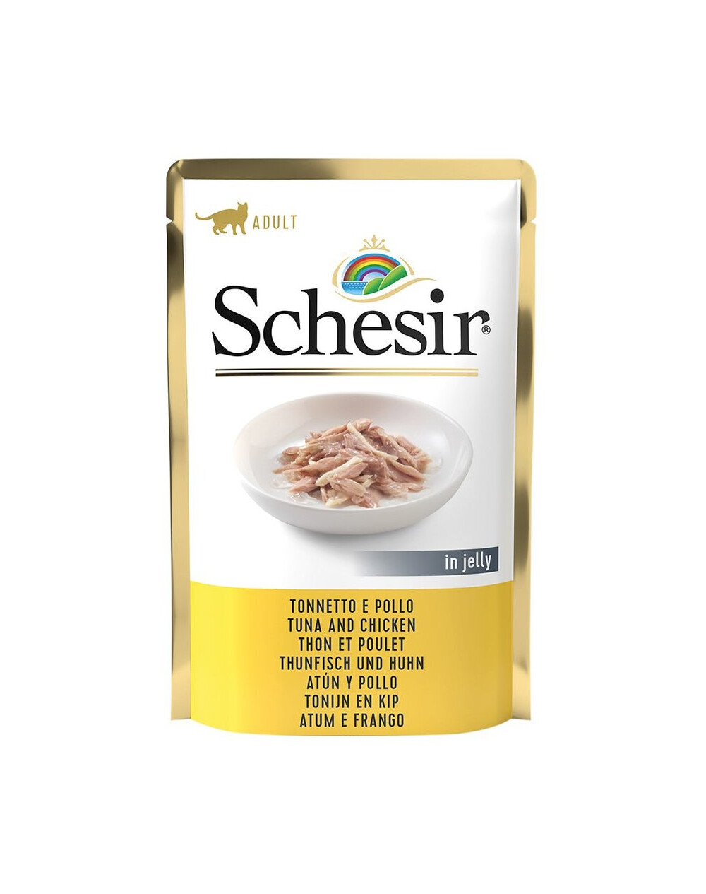 SCHESIR Thon aux filets de poulet en gelée est une nourriture humide qui associe de délicats filets de thon à du poulet juteux, le tout plongé dans une gelée légère et savoureuse.